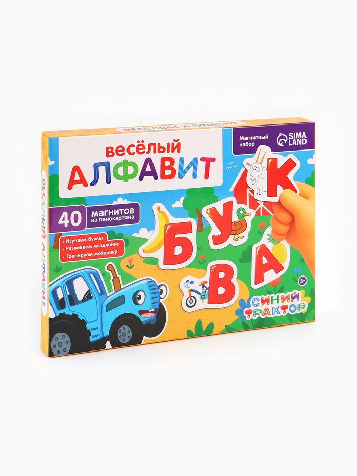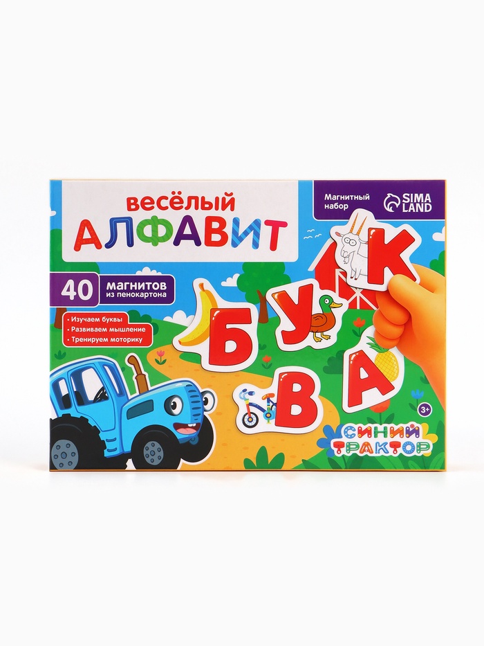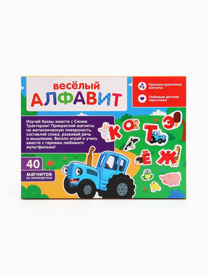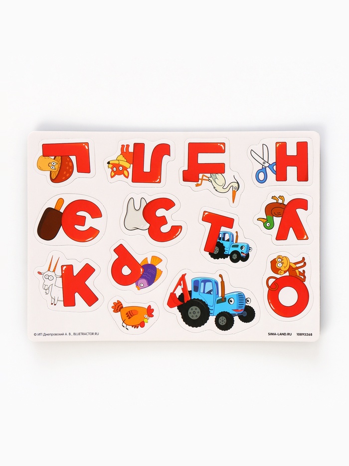 - Узнаваемые детские герои: буквы сопровождаются рисунками популярных мультяшных персонажей — синего трактора и его друзей. Это делает процесс обучения более привлекательным и понятным для детей.