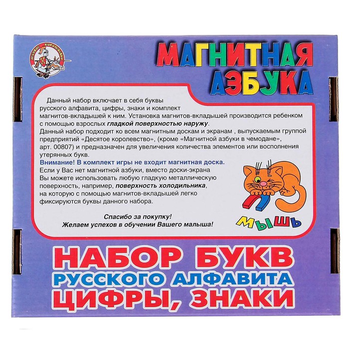 «Магнитная касса» — вспомогательный материал для начального обучения грамоте и цифрам для детей от 3-х лет. Набор включает в себя 78 элементов букв русского алфавита, цифр и знаков, а также комплект магнитов-вкладышей к ним. Установка магнитов-вкладышей производится ребенком самостоятельно или с помощью взрослых гладкой поверхностью наружу.