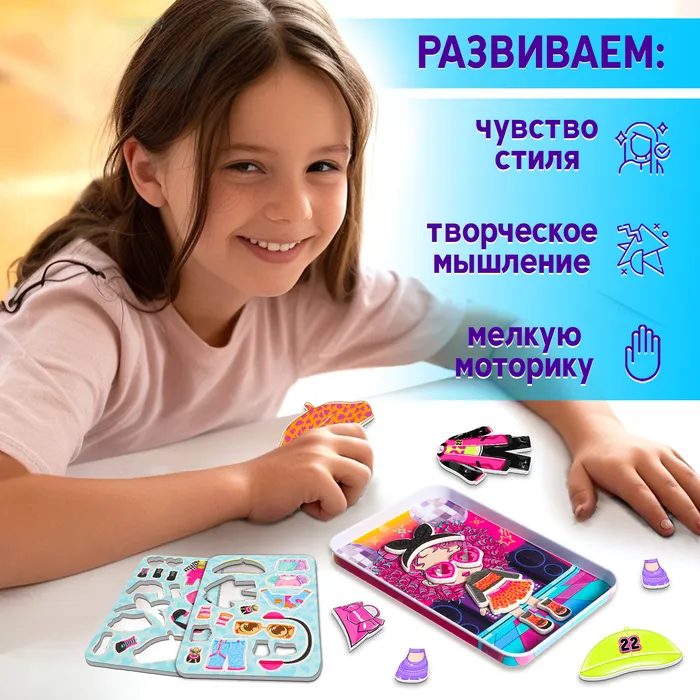 Ваша принцесса любит модничать? Тогда этот набор станет эффектным подарком для неё! Магнитный набор «Крутая вечеринка» позволит менять одежду куколке и создавать разные образы. С ним ребёнок не ограничен в выборе стиля и цветовой гаммы — в каждом из 6 образов можно легко комбинировать и менять одежду между собой.