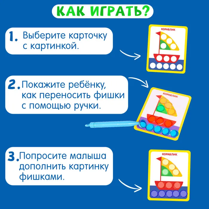 - Цепляйте на магнитную ручку фишки нужного цвета и составляйте весёлые картинки!