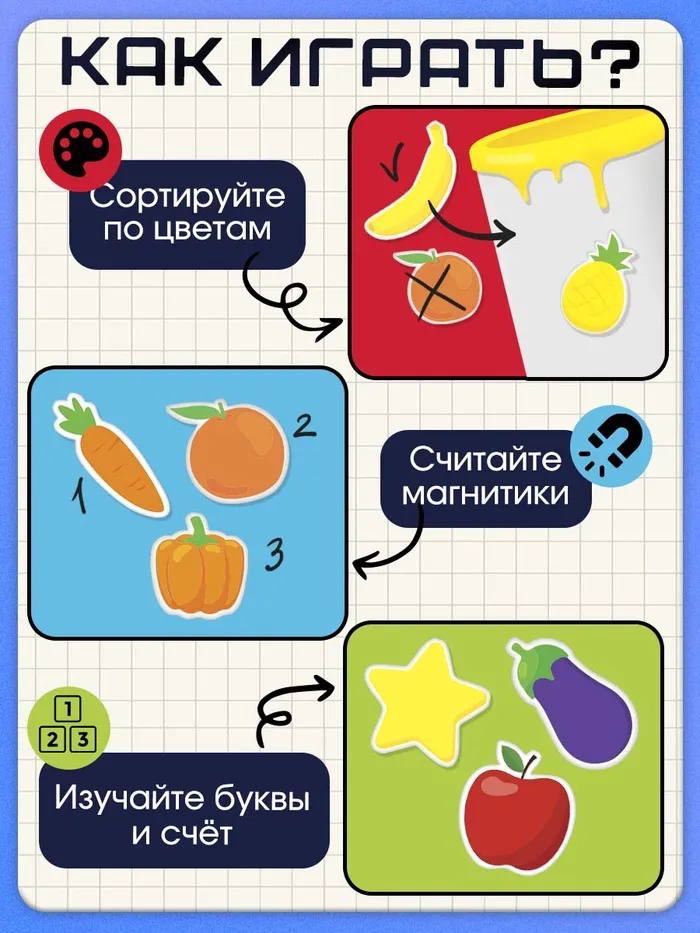 - Разложите перед ребёнком карточки с 8 заданиями в форме баночек, 40 магнитных фигурок и инструкцию.