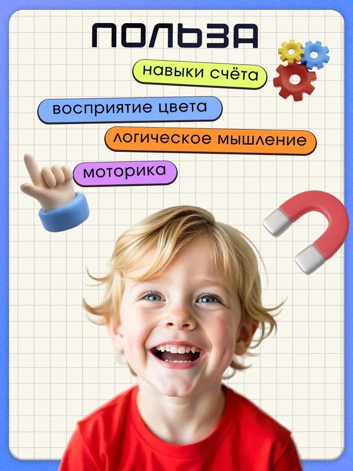 Игра создана для тренировки мелкой моторики и развития мышления. Ребёнок научится сортировать предметы по количеству, цветам и общему признаку. В процессе игры малыш освоит счёт.