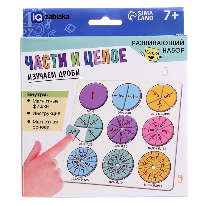 Магнитный набор «Части и целое» поможет ребёнку освоить азы математики и познакомиться с дробями в увлекательной форме. Он подходит для детей от 7 лет и делает обучение лёгким и наглядным. Благодаря магнитной основе элементы удобно крепятся на поверхность, а 50 красочных фишек помогут визуализировать дроби и их соотношение с целым.