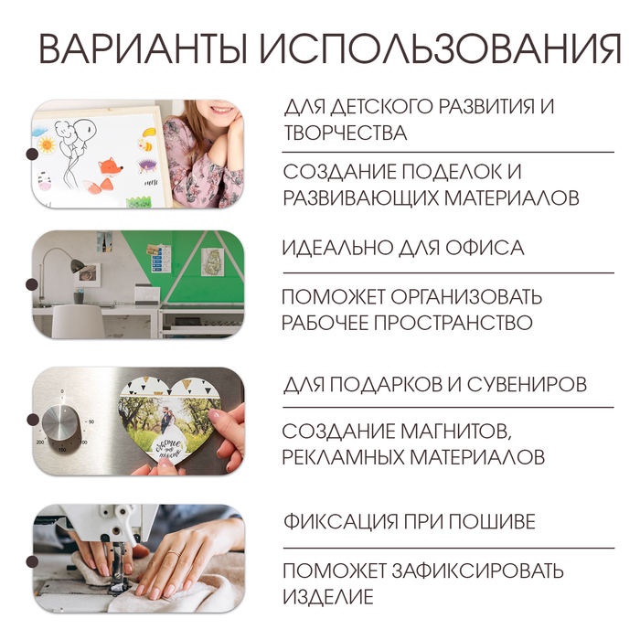 Самоклеящийся магнитный винил быстро приклеивается и надежно удерживается на любой ровной и гладкой поверхности. Магнитный винил широко используется дома и в офисах, в школах и детских садах, в поликлиниках и больницах. Это универсальный фиксатор для различных по весу и размеру полиграфических и рекламных материалов, сувенирной продукции и т.п. Если магнитный винил приклеить к стене, то на нём можно хранить очень легкие предметы: скрепки, гвозди, винты, иголки, маленькие ножи. Винил с клеевым слоем характеризуется удобством использования и широкой сферой применения. Магнитный винил легко режется обычными ножницами.