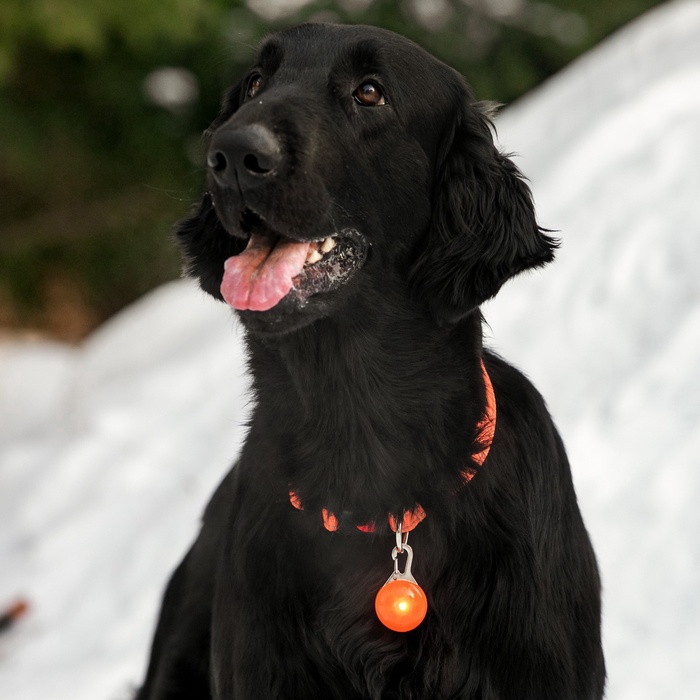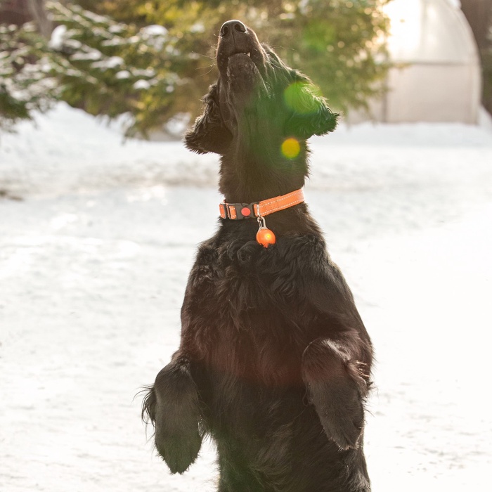 - Яркий дизайн: оранжевый оттенок хорошо воспринимается в темноте. Он не слепит, но чётко выделяет силуэт питомца на фоне асфальта, снега или травы.