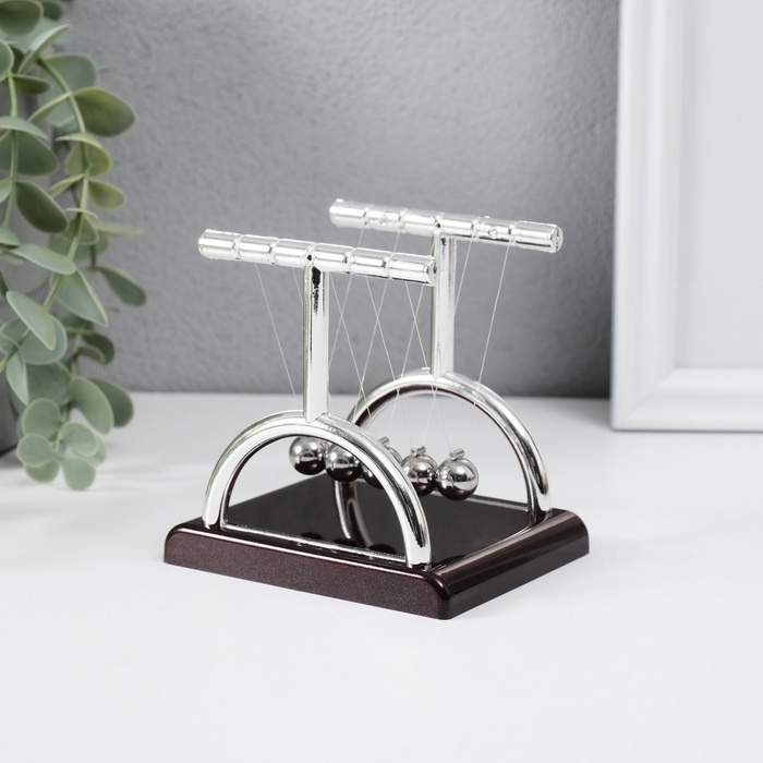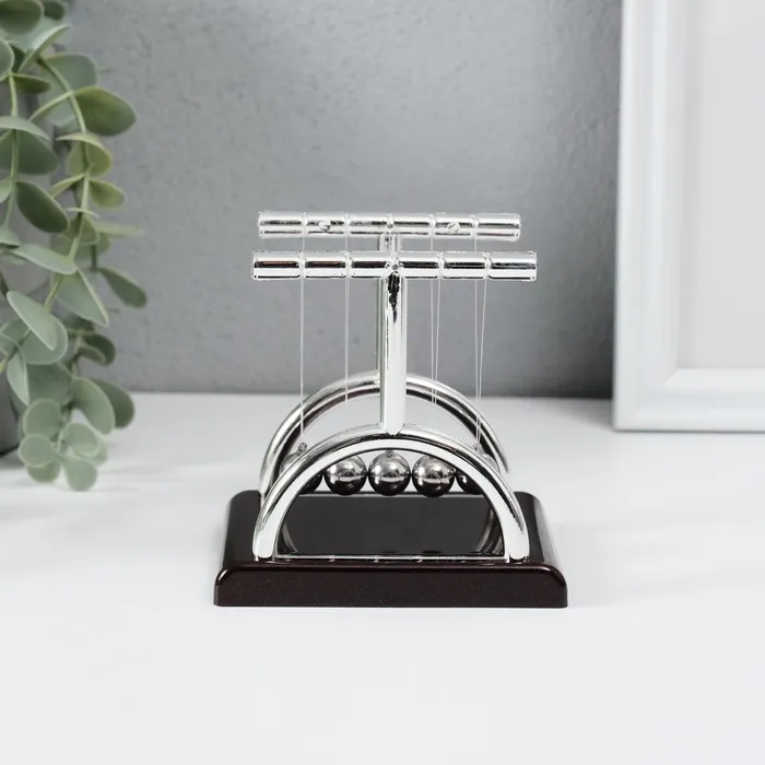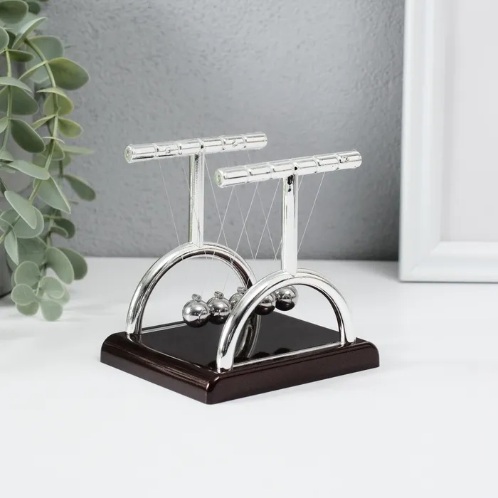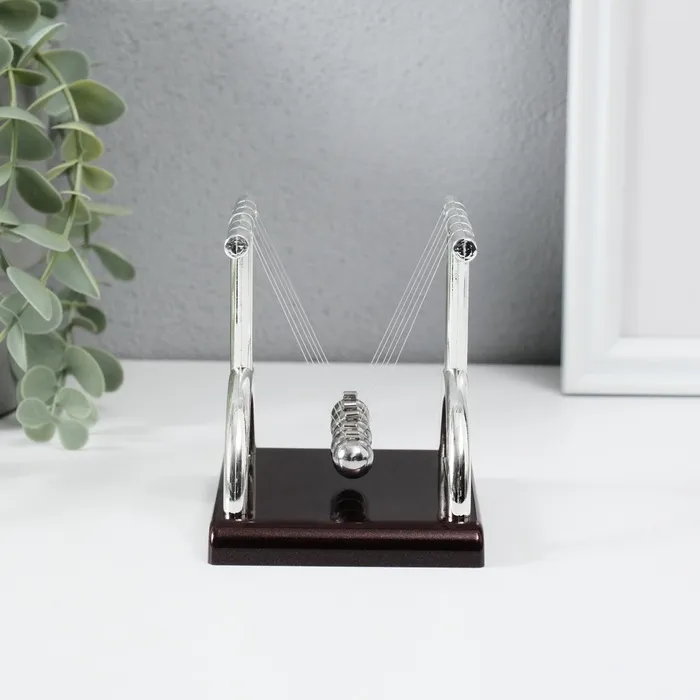 Маятник настольный антистресс «Шары Ньютона. Колыбель техно», квадрат столбик, 9×9×7.5 см сегодня пользуется огромной популярностью у наших клиентов. Система состоит из подставки и пяти металлических шариков, которые подвешены на леске. Для активации маятника вам необходимо отвести один шарик в сторону и отпустить его. Затем наблюдайте, как шарики с противоположной стороны начинают двигаться в зеркальном отображении с той же скоростью. Через определенное время шарики останавливаются. Продолжительность движения зависит от размера и веса шариков: чем тяжелее и больше шарики, тем дольше процесс, и наоборот.