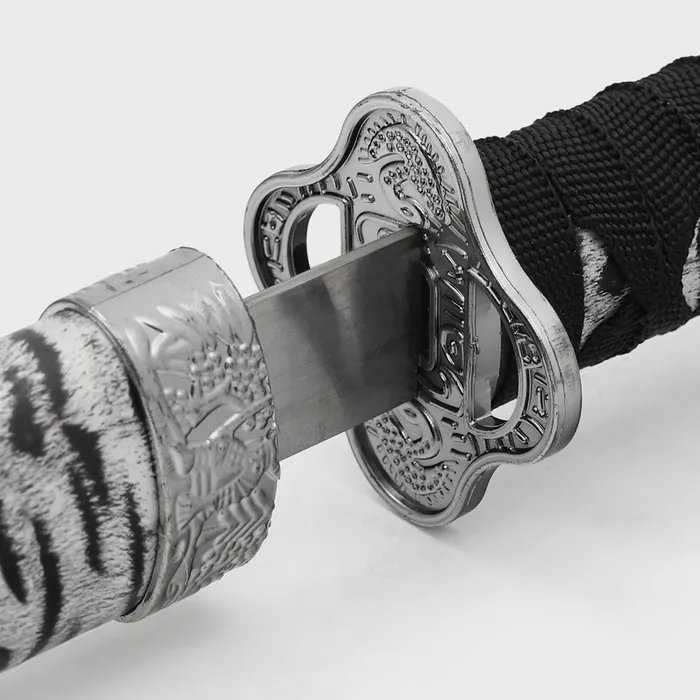Погрузитесь в мир восточной эстетики с оригинальным сувениром, который станет не только ярким акцентом вашего интерьера, но и символом утончённого вкуса — макетом катаны с серыми ножнами под зебру. С длиной 89 см, этот элемент декора идеально подходит для создания уникальной атмосферы в вашем доме или офисе.