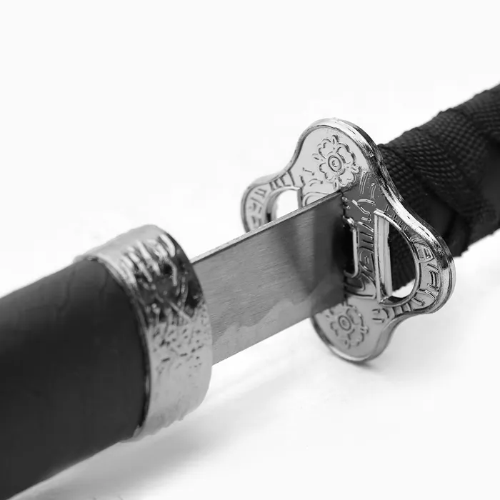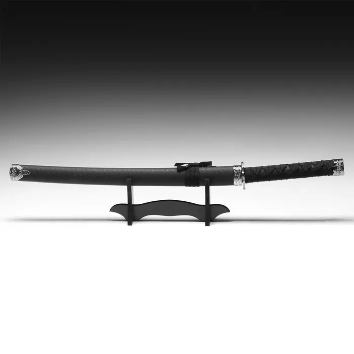 Элегантный черный цвет и матовая отделка придают этому аксессуару стильный и современный вид. Ножны, оформленные под змеиную кожу, добавляют уникальности, а металлическое лезвие создает ощущение подлинности. В комплект входит подставка, что позволяет удобно экспонировать катану в интерьере, превращая её в эффектный элемент декора.