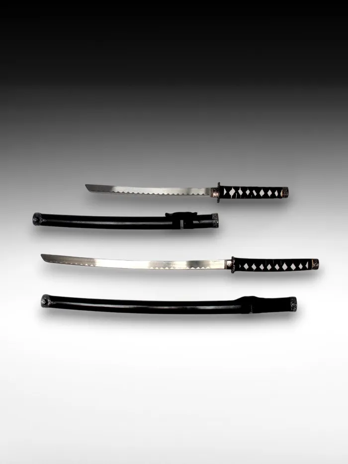 - Два стильных изделия: В набор входят две катаны, каждая из которых имеет уникальный дизайн и длину, что позволяет разнообразить оформление.