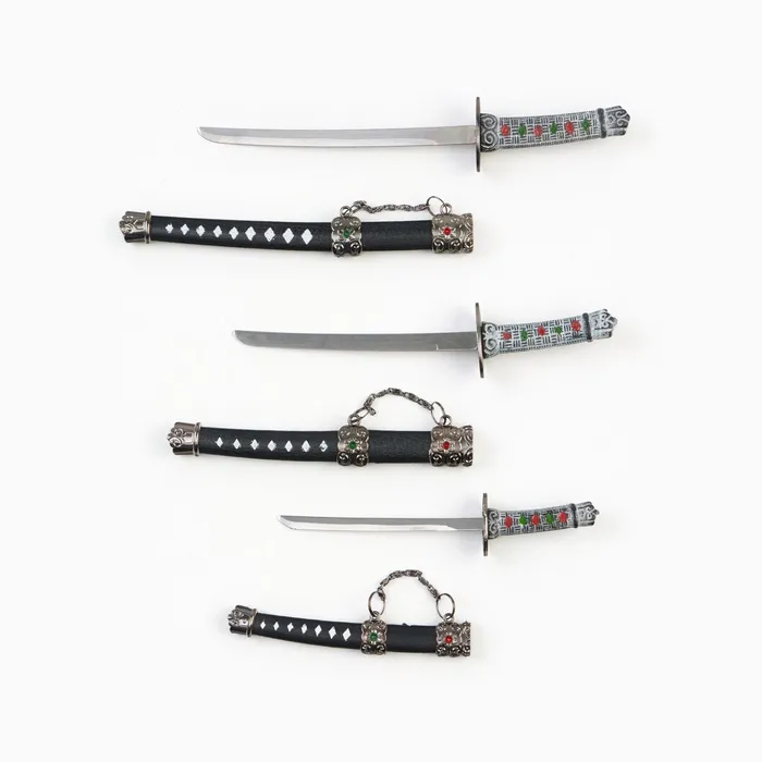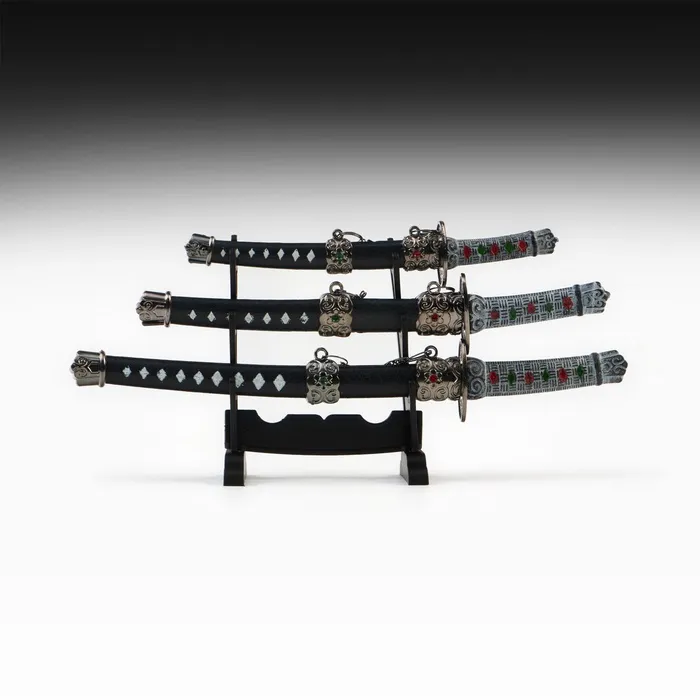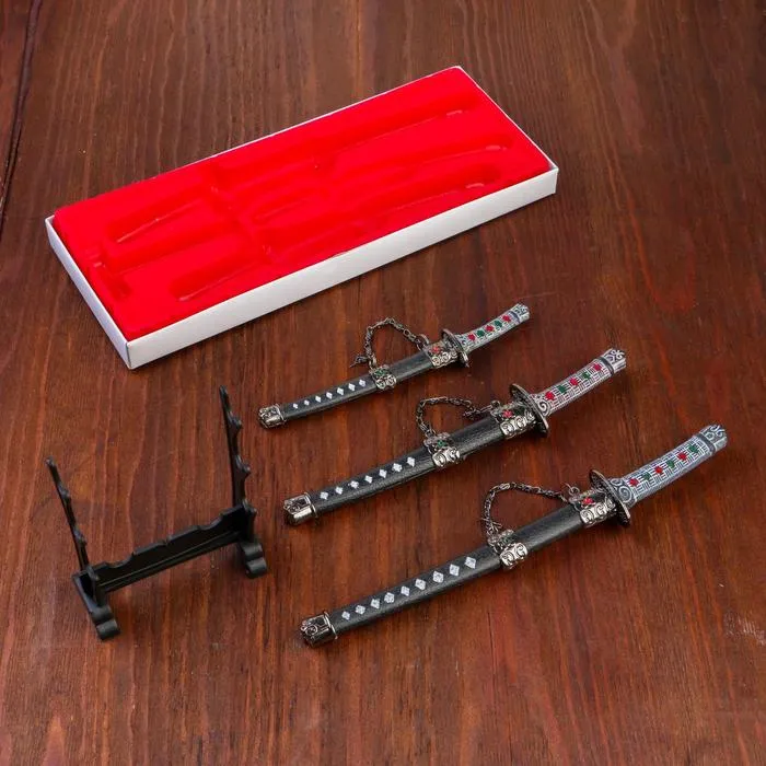 Подарите себе или своим близким уникальный набор, который станет настоящим украшением любого интерьера — это потрясающие сувенирные катаны на подставке, выполненные в стильном черном цвете с белыми ромбами. Этот набор из трех катан разной длины (16 см, 20 см и 24,5 см) привнесет в ваш дом атмосферу восточной культуры и элегантности.