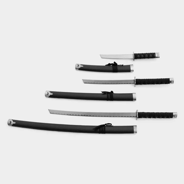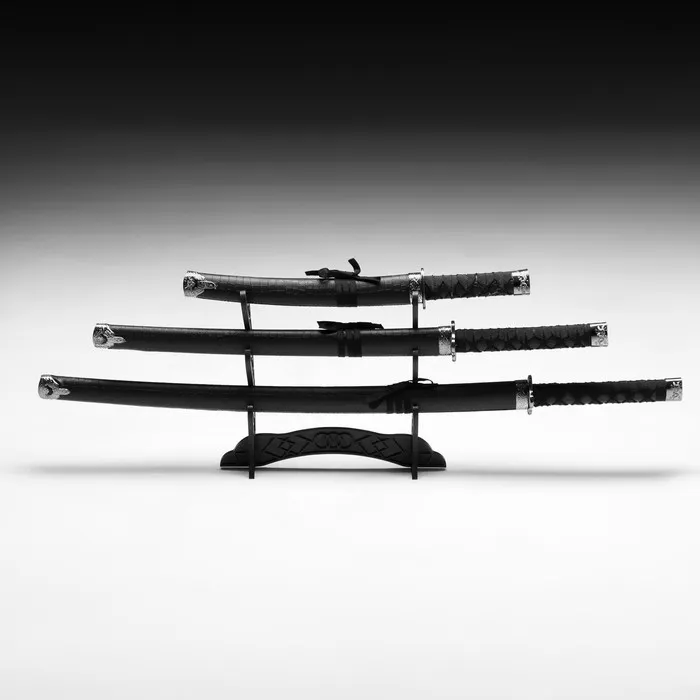 В набор входят три катаны длиной 46 см, 70 см и 89 см. Это разнообразие размеров позволяет выбрать подходящий вариант для любого пространства. Специальная подставка надежно удерживает катаны, превращая их в эффектный элемент декора.