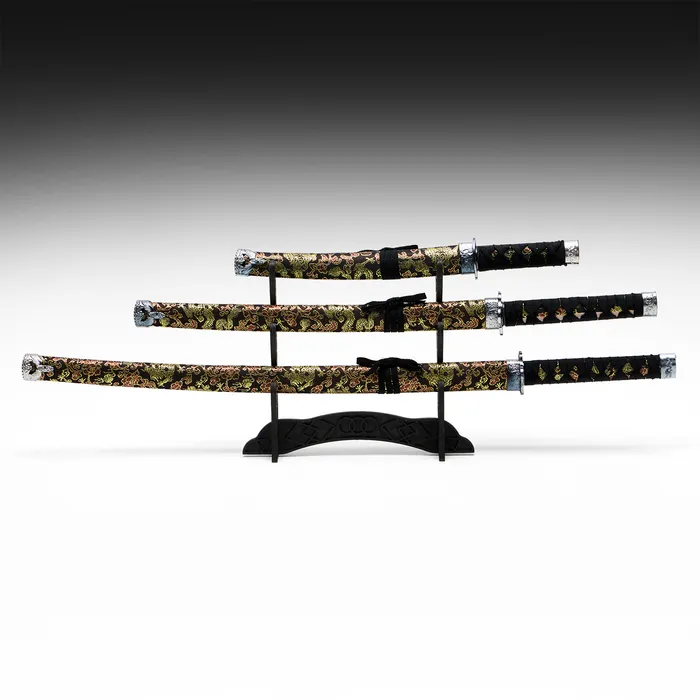 - Удобство хранения: Набор комплектуется стильной подставкой, позволяющей удобно разместить катаны в любом интерьере и демонстрировать их как произведение искусства.