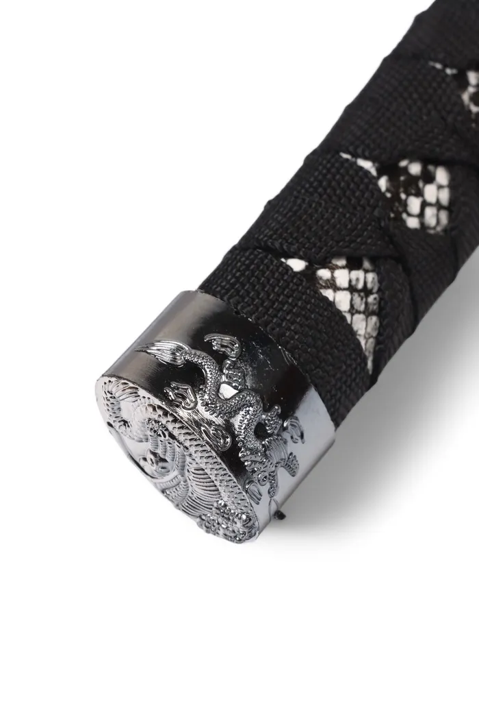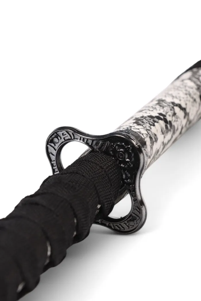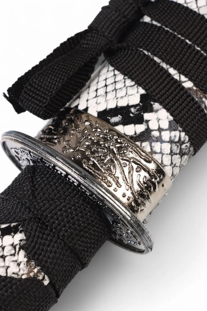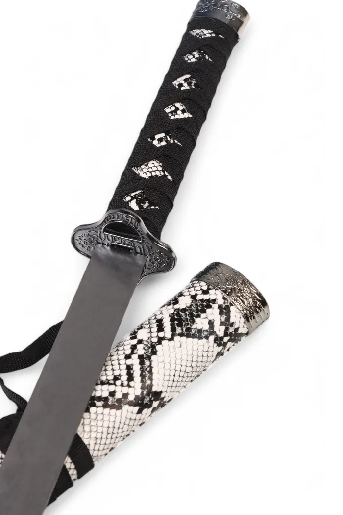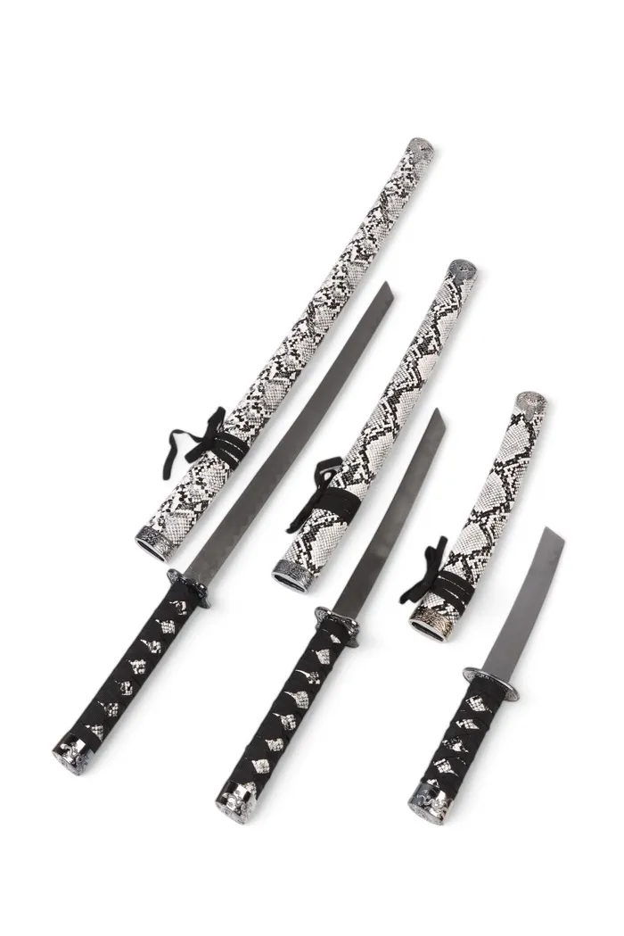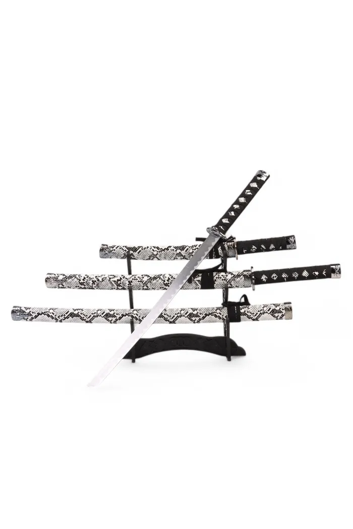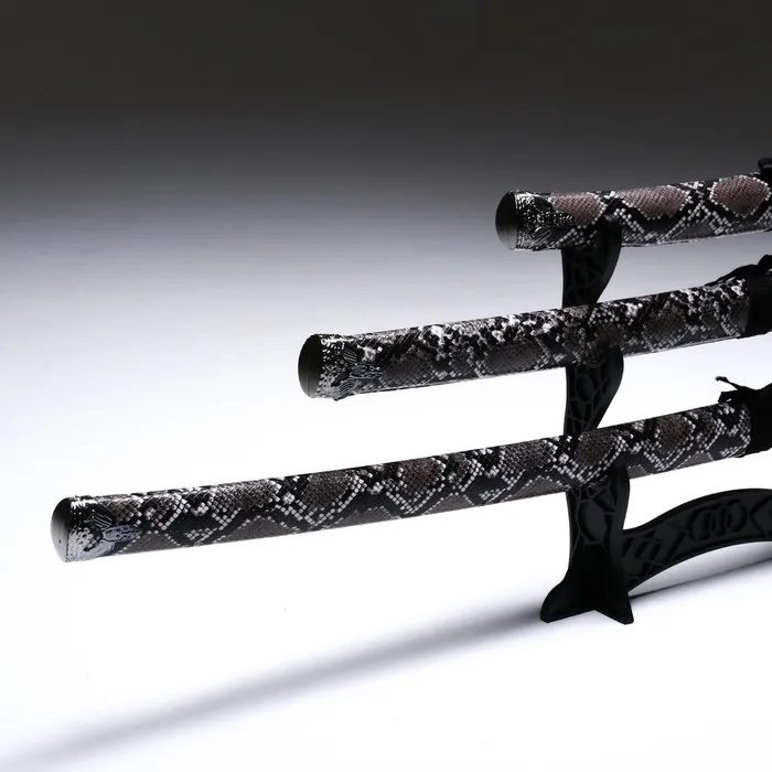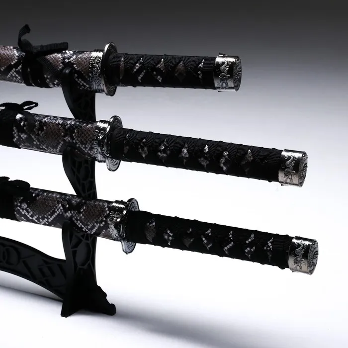 Откройте для себя уникальный подарочный набор, который станет не только стильным украшением вашего интерьера, но и символом восточной культуры — это набор с тремя катанами, оформленными в элегантном стиле серого змеи. Длина лезвий 47 см, 70 см и 89 см идеально подходят для демонстрации, а их утонченный дизайн с серыми акцентами привнесет атмосферу загадочности и изысканности в любой уголок вашего дома.