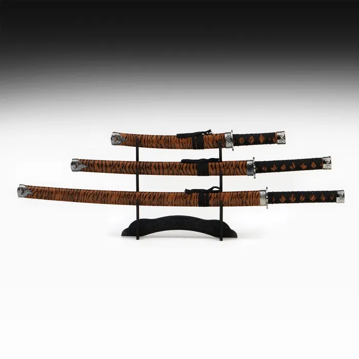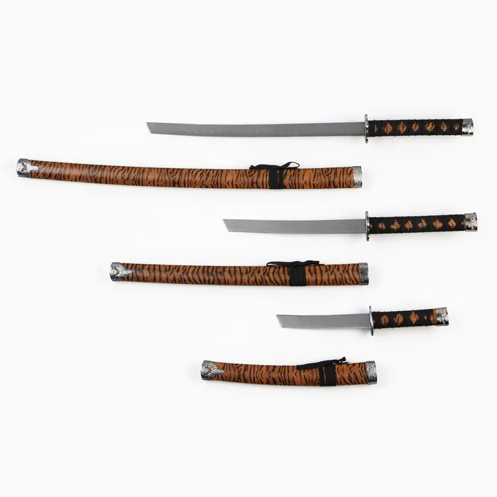 Представляем вам набор катан, который станет великолепным подарком для ценителей восточной культуры и коллекционеров. Этот комплект включает три катаны разной длины, каждая из которых оформлена в стильных ножнах с тигровым дизайном, что добавляет уникальности и выразительности.