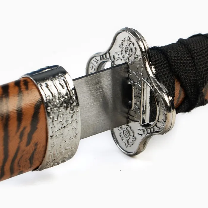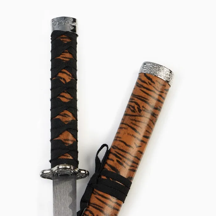 - Стильные ножны под тигра подчеркивают восточную эстетику и делают набор привлекательным для демонстрации.