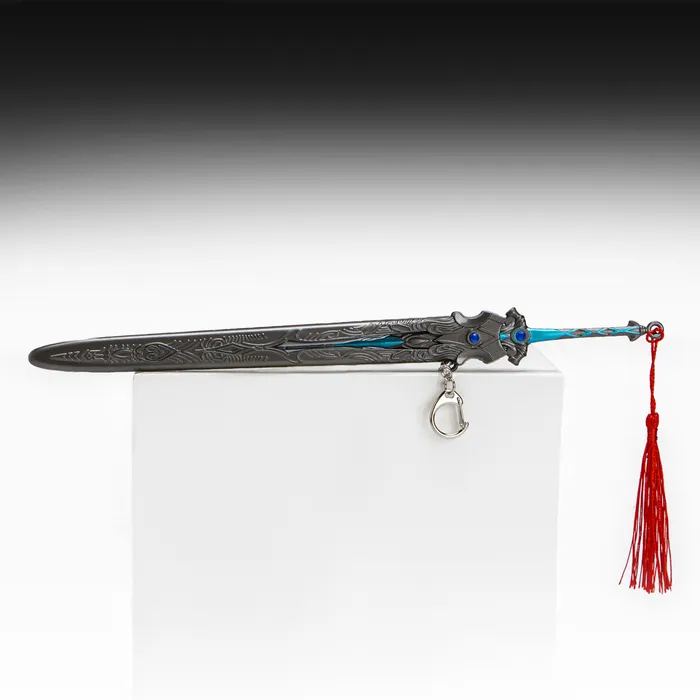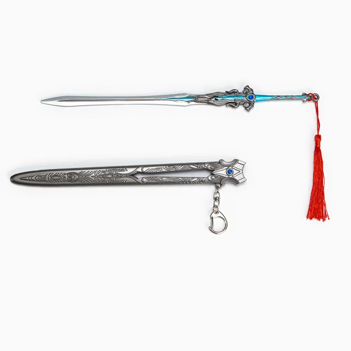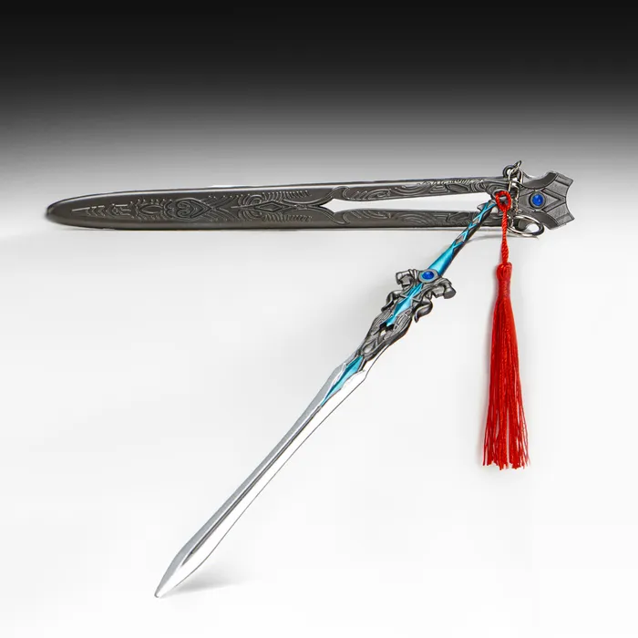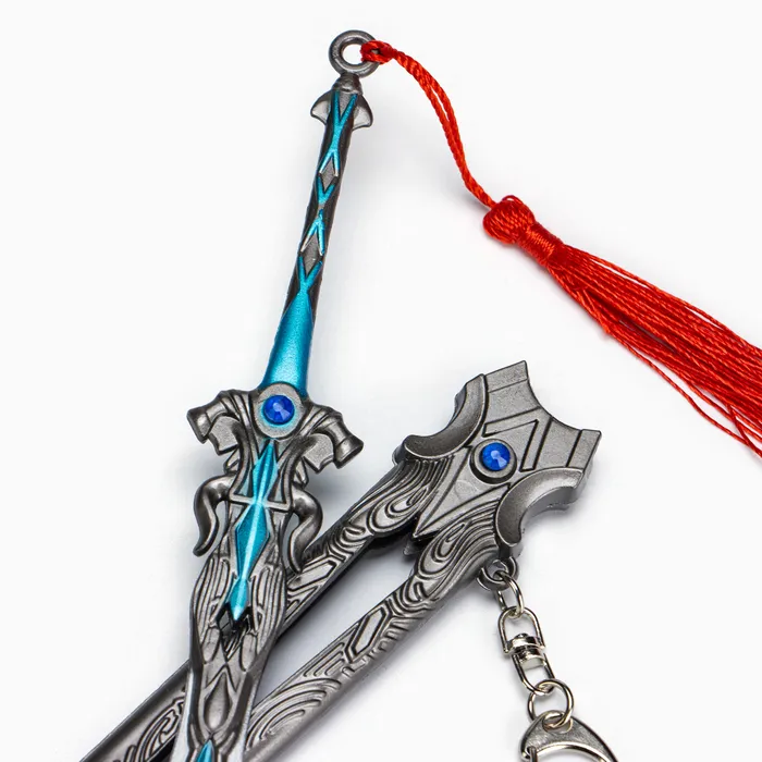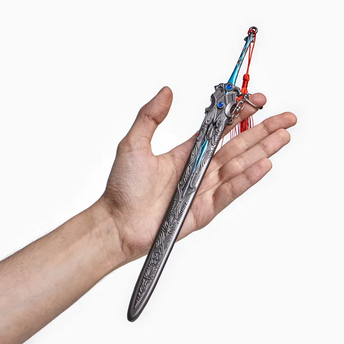 Откройте для себя уникальный аксессуар, который не только подчеркнёт ваш стиль, но и станет символом вашей любви к культуре — подвесной брелок в виде меча. С длиной 27 см и элегантным серебристым цветом, дополненным голубыми акцентами, этот брелок станет настоящим украшением ваших ключей или сумки.