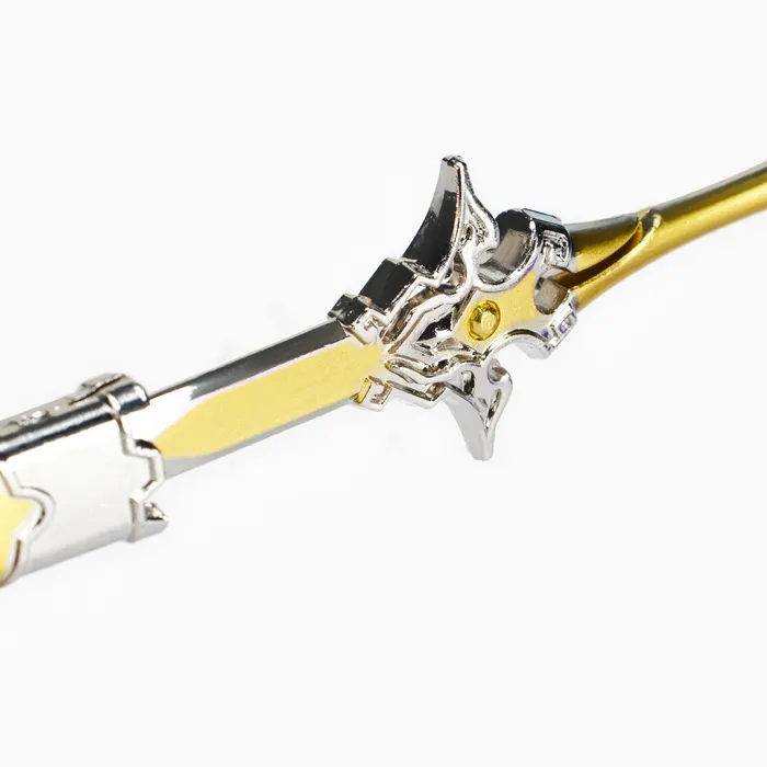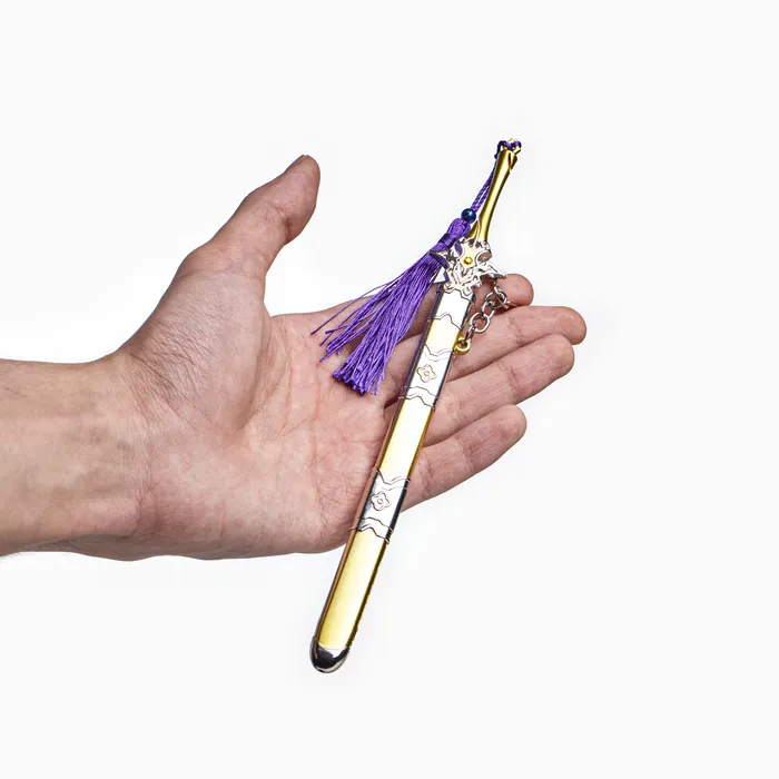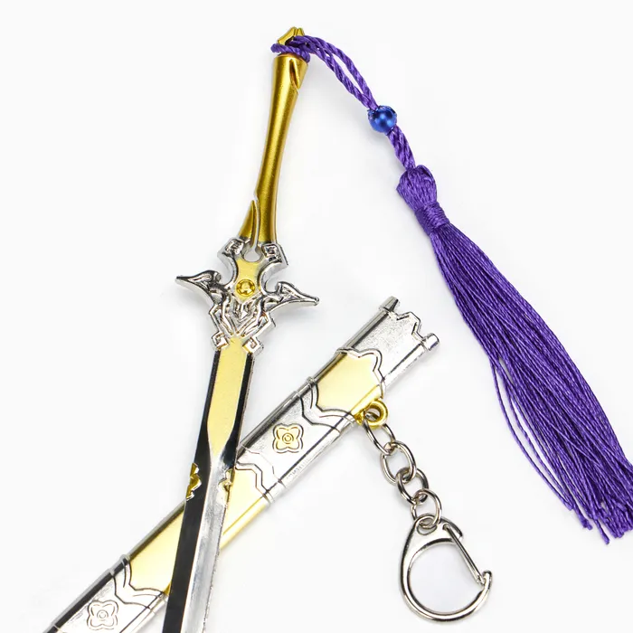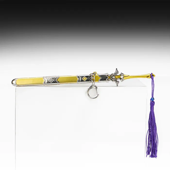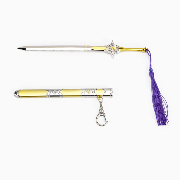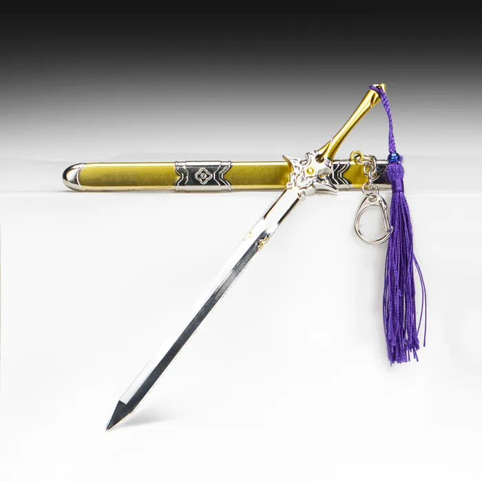 Представляем вашему вниманию подвесной брелок в виде золотого меча с фиолетовыми акцентами, вдохновленный известной игрой. Этот уникальный аксессуар не только станет стильным дополнением к вашим ключам или рюкзаку, но и подчеркнет вашу любовь к миру фантазий и приключений.