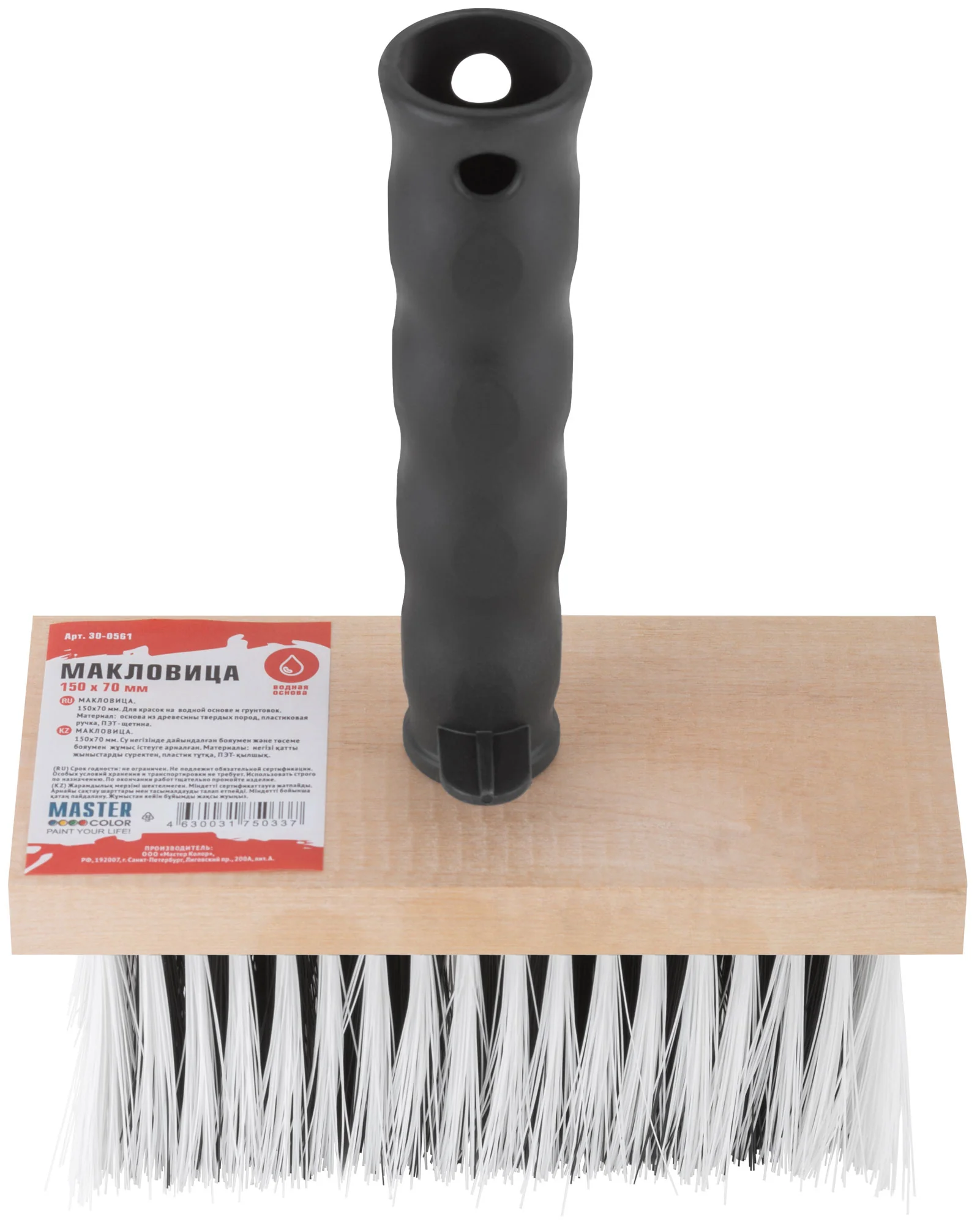 Конструкция макловицы включает деревянную основу и эргономичную пластиковую ручку, которая обеспечивает комфортный захват и легкость в использовании. Синтетическая щетина из ПЭТ-волокна устойчива к износу и деформации, что позволяет использовать макловицу для интенсивных работ.