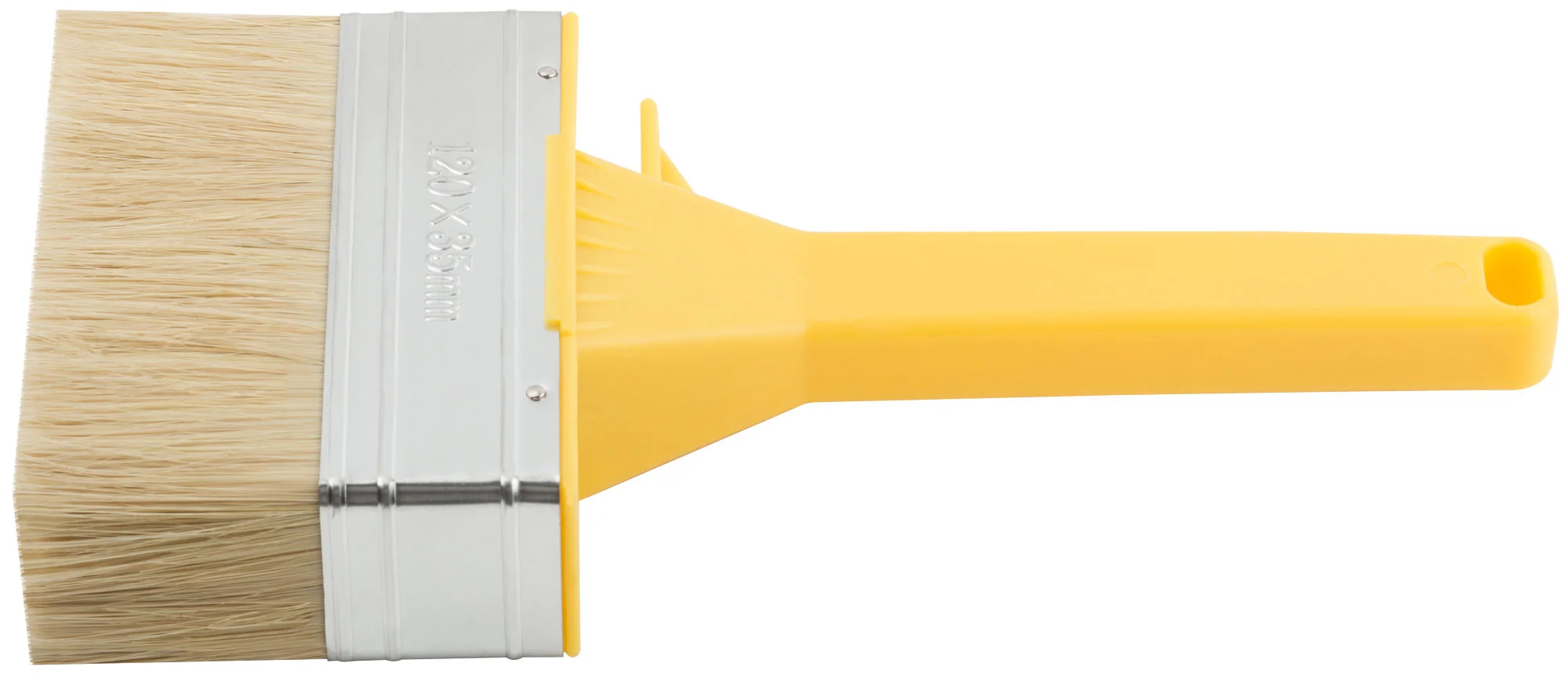 Макловица выполнена с использованием натуральной светлой щетины, что гарантирует долговечность и равномерное нанесение материала. Сплошной пластиковый корпус и полая ручка делают её лёгкой и устойчивой к воздействию химических веществ. Выемка на ручке позволяет удобно закреплять кисть на ведре или банке с краской.