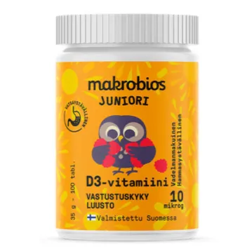 Macrobios Junior Витамин D3 10мг, 100шт. Эта жевательная добавка витамина D со вкусом малины, подслащенная ксилитом, не оказывает вредного воздействия на детские зубы. С ароматом натуральной малины, он приятен на вкус и легко жуётся ребенком. Витамин D способствует нормальному функционированию иммунной системы и поддерживает здоровье костей и зубов.
