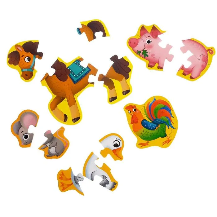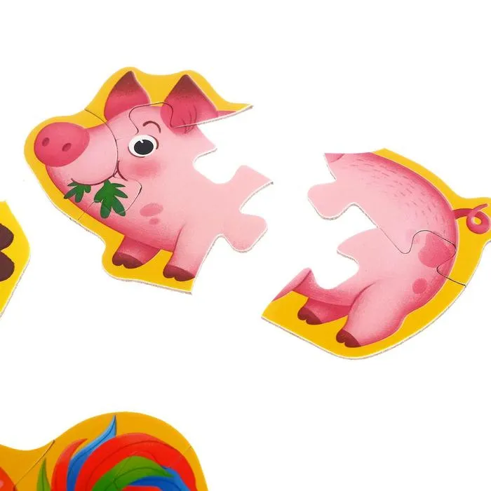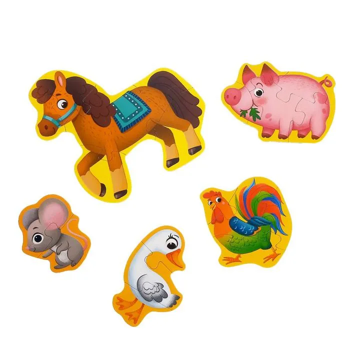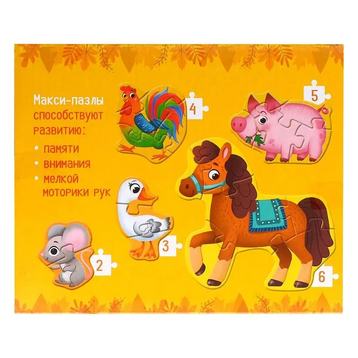Макси-пазлы «Наша ферма» — это 20 деталей, из которых ребёнок соберёт 5 разных картинок и познакомится с животными фермы. Мозаики помогут развить усидчивость, координацию движений и мелкую моторику рук, а также научат находить связь между частью и целым.