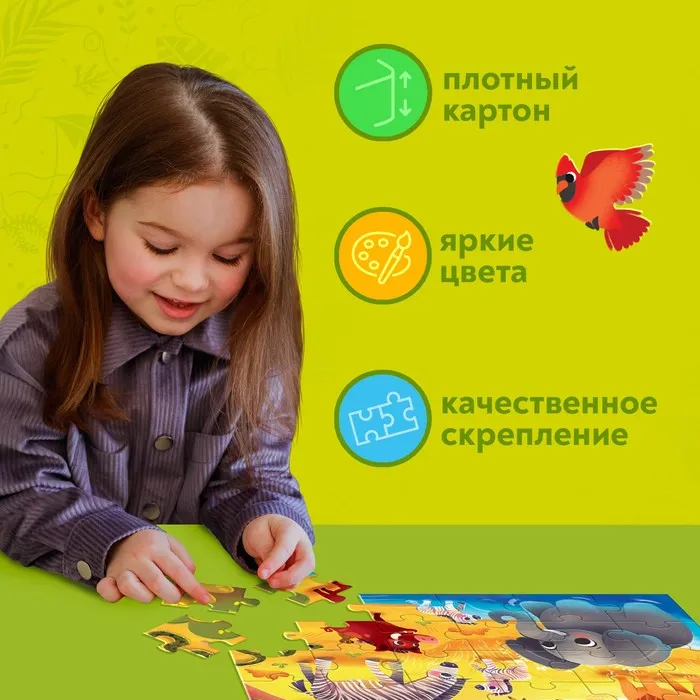 Собрав все 30 крупных деталей, малыш получит красочную картинку размером 29 × 21 см.