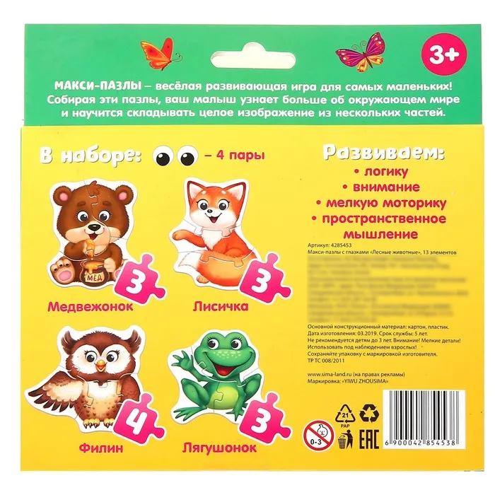Макси-пазлы с глазками «Лесные животные» — это 13 деталей, из которых ребёнок соберёт 4 разных пазла и познакомится с животными леса. Макси пазлы помогут развить усидчивость, координацию и мелкую моторику рук, а также научат находить связь между частью и целым.