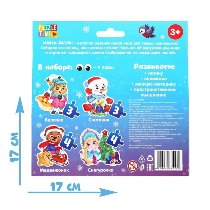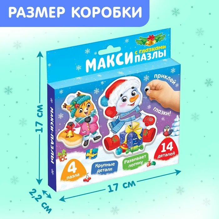 Макси-пазлы с глазками «Помощники Дедушки Мороза» — это 14 деталей, из которых ребёнок соберёт 4 разных пазла и познакомится с животными леса и сказочными персонажами. Макси пазлы помогут развить усидчивость, координацию и мелкую моторику рук, а также научат находить связь между частью и целым.
