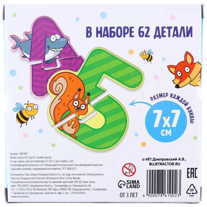 Пазлы «Синий трактор: От А до Я» — это увлекательная настольная игра для детей от 3 лет, которая объединяет обучение и развлечение. С помощью этих пазлов ребёнок познакомится с буквами и русским языком, развивая при этом память, внимание и мелкую моторику.