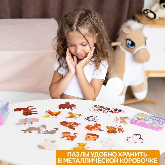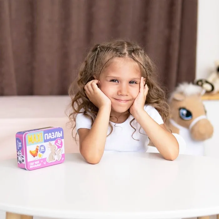 Макси-пазлы «Весёлые зверята» — это 36 деталей, из которых ребёнок соберёт 18 разных пазлов. В процессе малыш познакомится с животными.