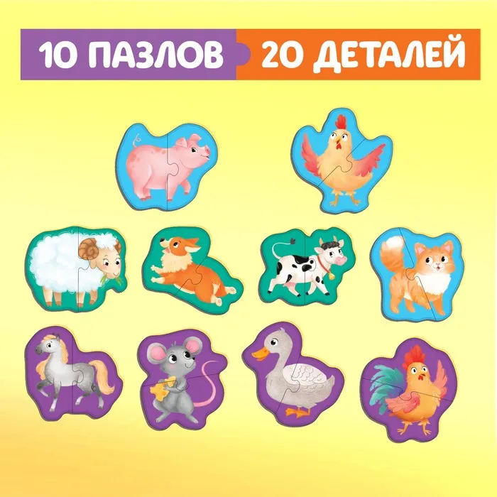 - Из 20 деталей ребёнок соберёт 10 разных пазлов и познакомится с домашними животными.