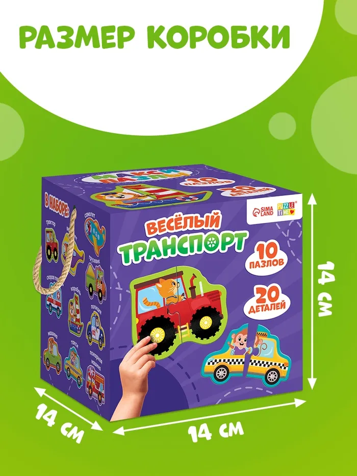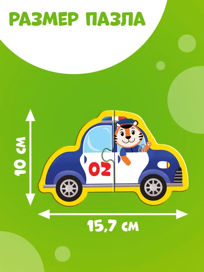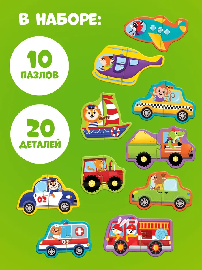 - 10 фигурных пазлов — каждый представляет собой отдельную машинку, например, трактор или такси.