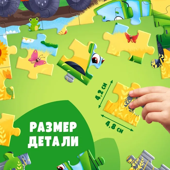 Собрав все 30 крупных деталей, малыш получит красочную картинку размером 29 × 21 см.
