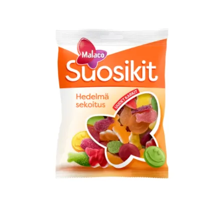 Мармелад Malaco Suosikit - это любимый фруктовый микс! В упаковке есть восемь разных вкусов представленных в забавных формах. Многообразие цветов, форм и вкусов - среди изобилия сладостей мармелад занимает особое место. Лёгкая и вкусная сладость давно полюбилась как детям, так и взрослым. Благодаря своей нежной текстуре изделие отлично сочетается с чаем или лёгким перекусом. А так же мармелад можно использовать в качестве необычного украшения к десертам!