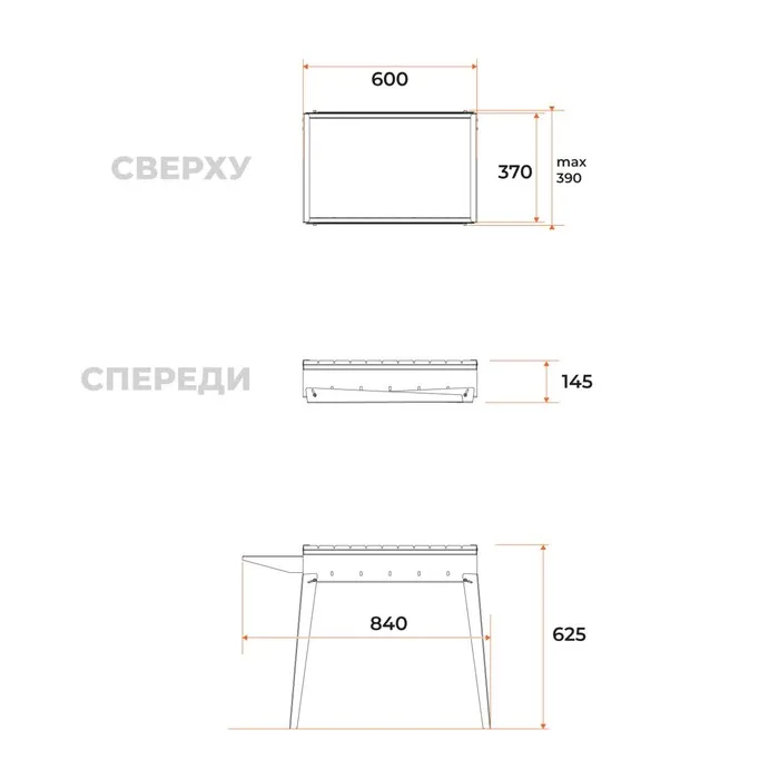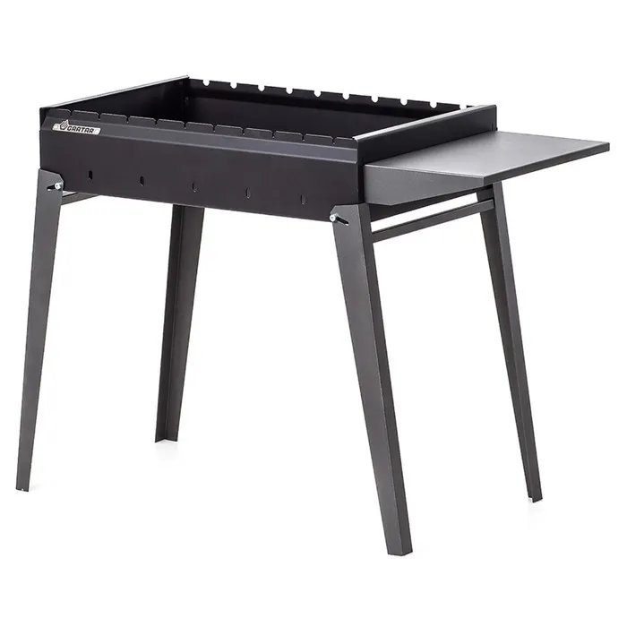 Компактный и надёжный. В сложенном виде удобно хранить и перевозить.Выдерживает дровяную растопку. Складные ножки. Полка для размещения продуктов и инструментов.