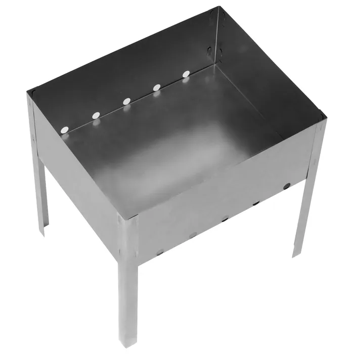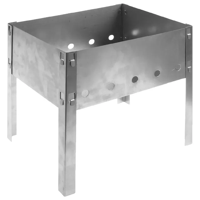 Мангал разборный «Мини» — облегчённая мобильная конструкция для быстрой сборки. Используется для приготовления мяса, рыбы, овощей на открытом огне или древесных углях. Выполнен из стали, на боковых стенках имеются отверстия для поддува.