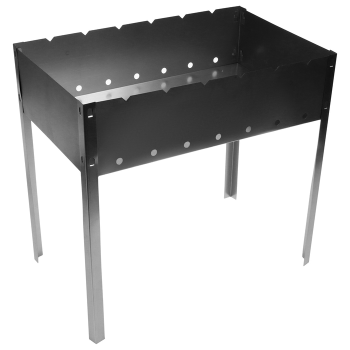 Мангал разборный «Стандарт» — облегчённая мобильная конструкция для быстрой сборки. Используется для приготовления мяса, рыбы, овощей на открытом огне или древесных углях. Изготовлен из стали, на боковых стенках имеются отверстия для поддува.
