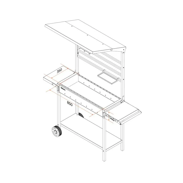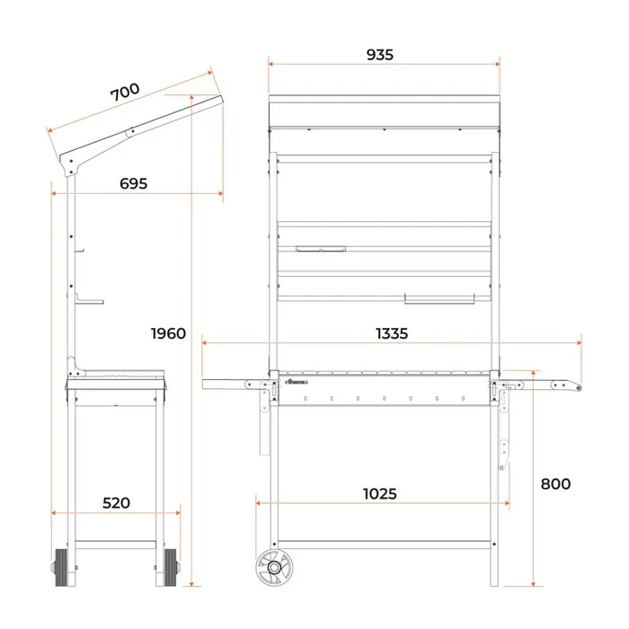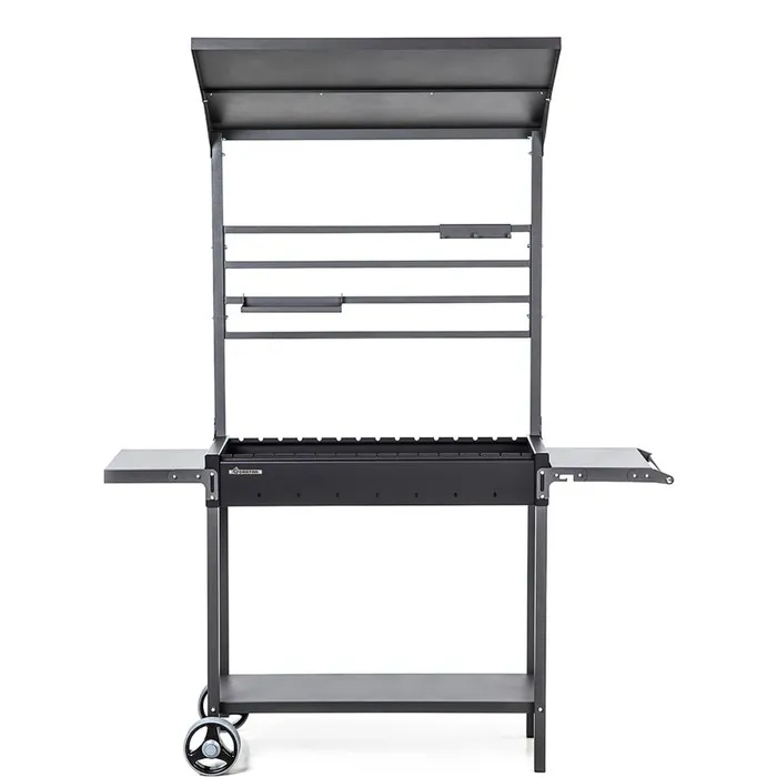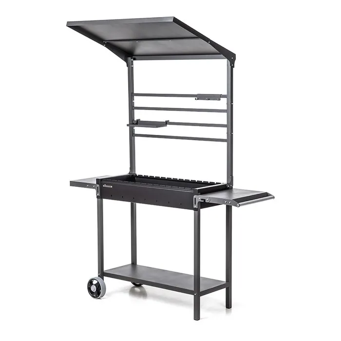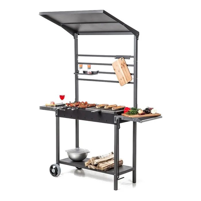 Настоящее кухонное пространство в компактной упаковке. Вместительный гриль-мангал из толстой стали для тех, кто хочет, чтобы продукты, приправы и кухонные инструменты всегда были под рукой.Выдерживает дровяную растопку. Колёса для удобства перемещения. Две полки для размещения продуктов и инструментов. Крыша-навес с полками и крючками.
