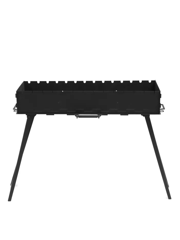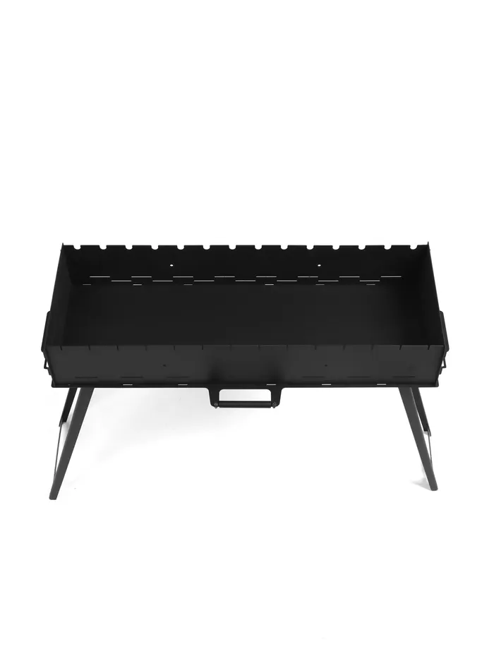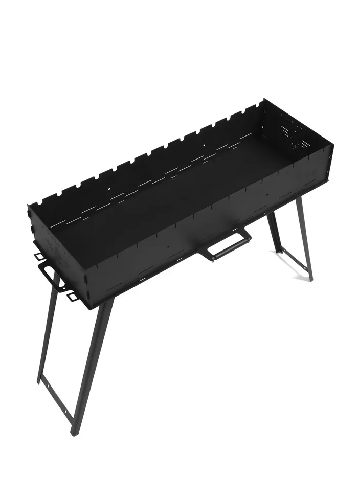 Прямоугольная жаровня длиной 85 см позволяет одновременно готовить шашлыки, овощи, рыбу и мясо для компании. 14 отверстий с каждой стороны надежно фиксируют шампуры, а сквозная лазерная резка на торцах обеспечивает равномерное горение углей. Высокие ножки с усиливающими перекладинами делают процесс готовки комфортным - не нужно наклоняться, а устойчивая конструкция минимизирует риск опрокидывания.
