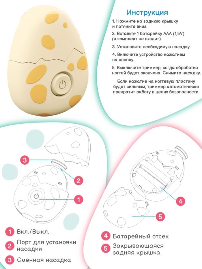 Маникюрный набор «Детский триммер для ногтей. Дино яйцо», 3 сменнные насадки, от 0мес. — Характеристики