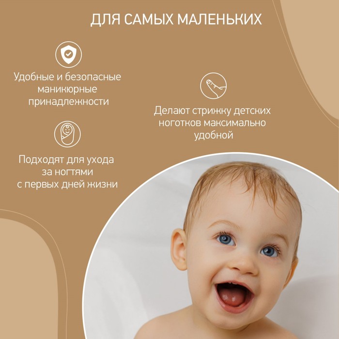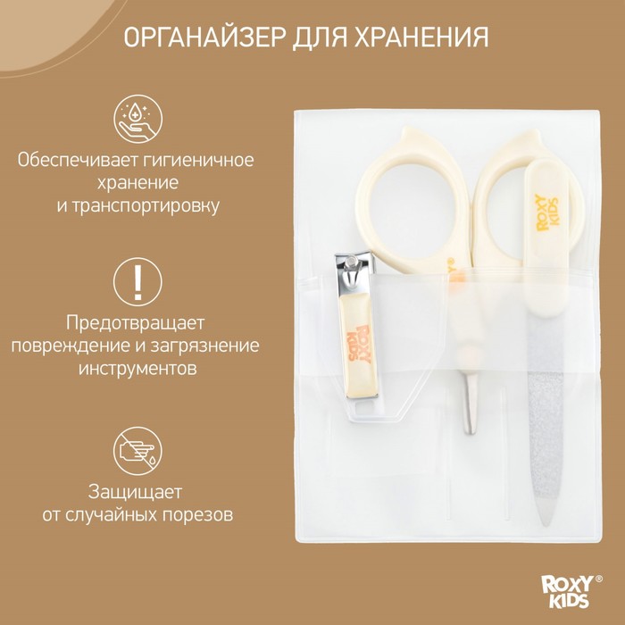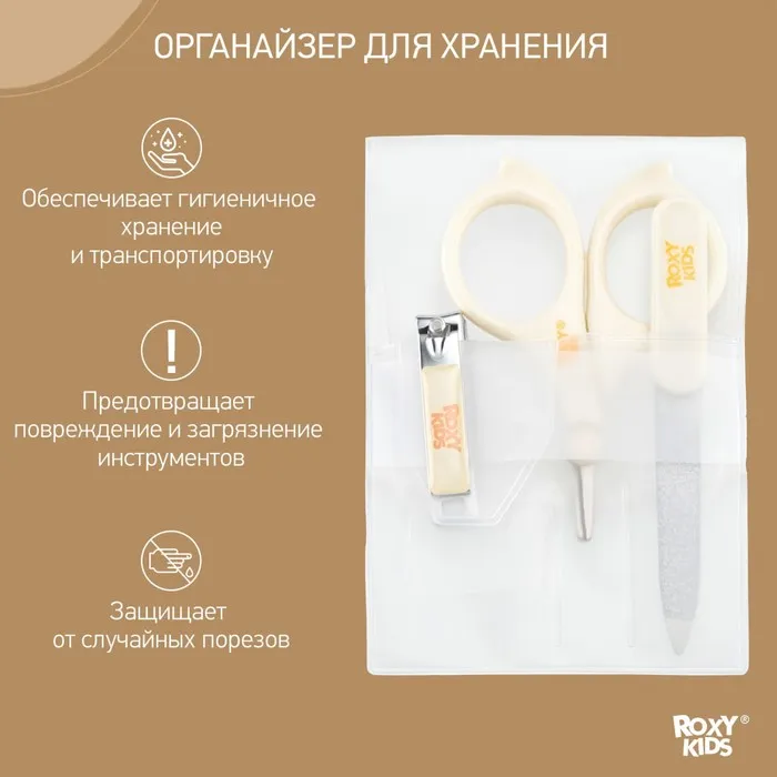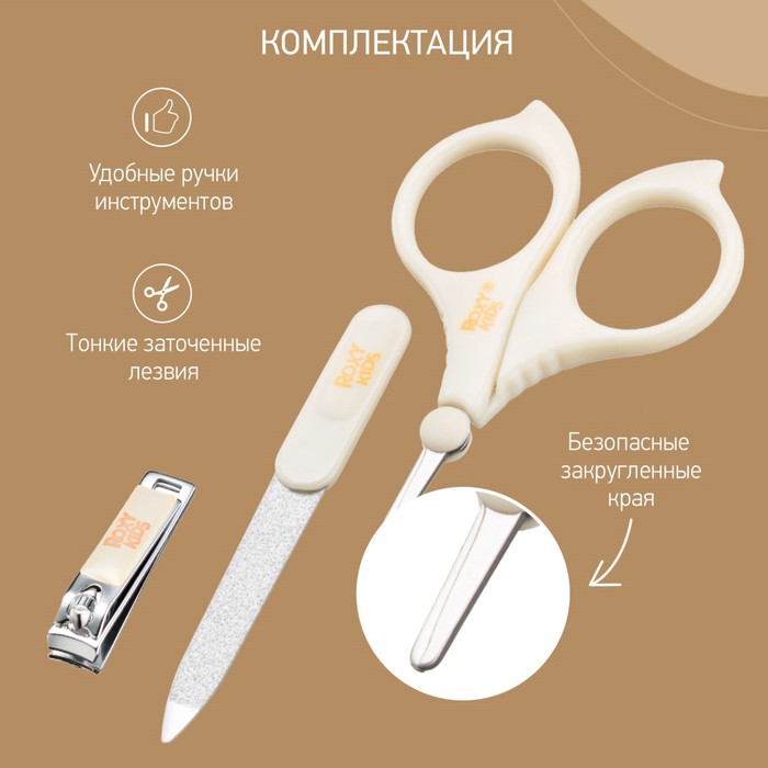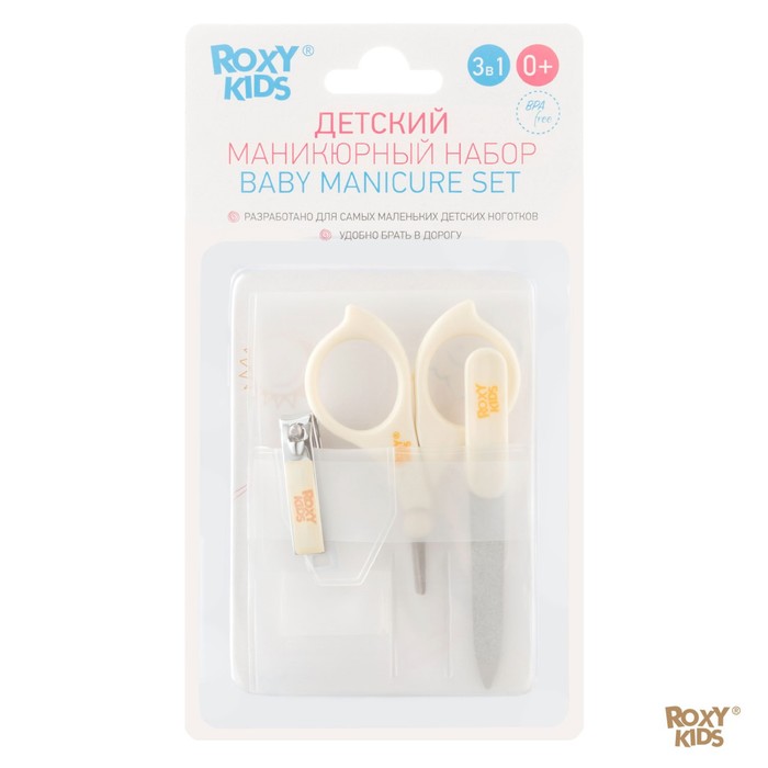 Маникюрный набор для новорожденных и малышей 3в1 от ROXY-KIDS поможет полноценно ухаживать за первыми ноготочками малыша. Детские ножницы, пилочка и кусачки от созданы специально для того, чтобы ухаживать за ручками и ножками малышей с первых дней жизни. Они совсем маленькие, но тщательно продуманы для того, чтобы стрижка ногтей была максимально удобной и безопасной. К примеру, у ножниц закруглены концы, чтобы в случае, если ребенок сделает резкое движение, они не поранили его. А лезвия из металла очень тонкие, чтобы процесс был оптимально мягким.