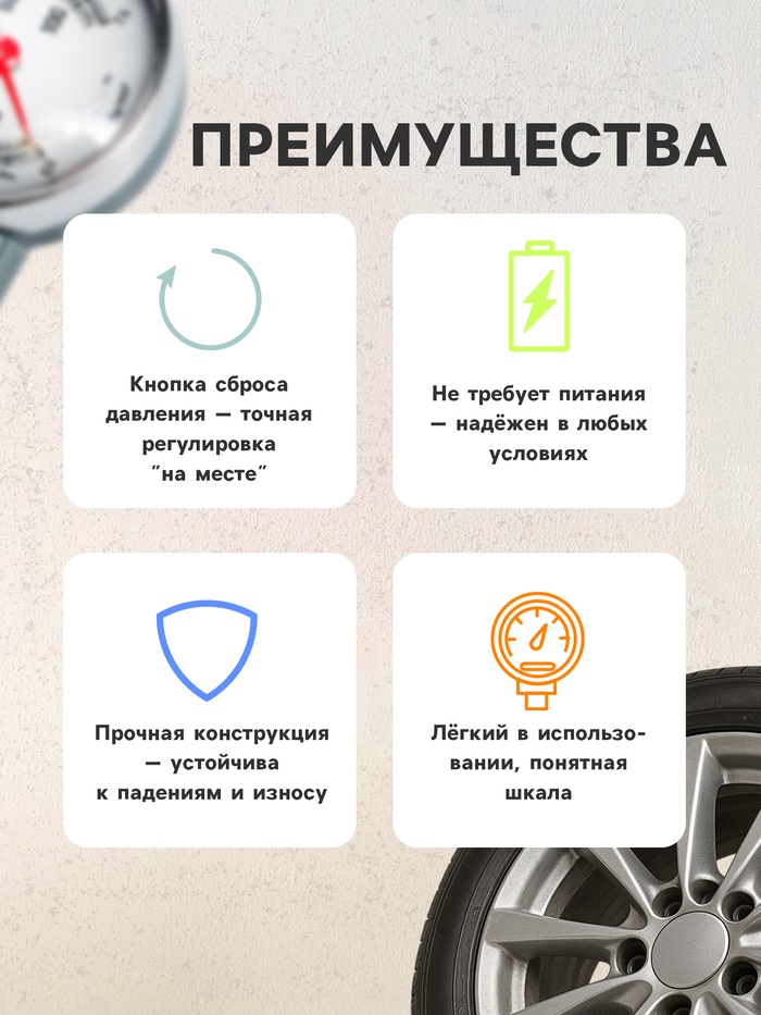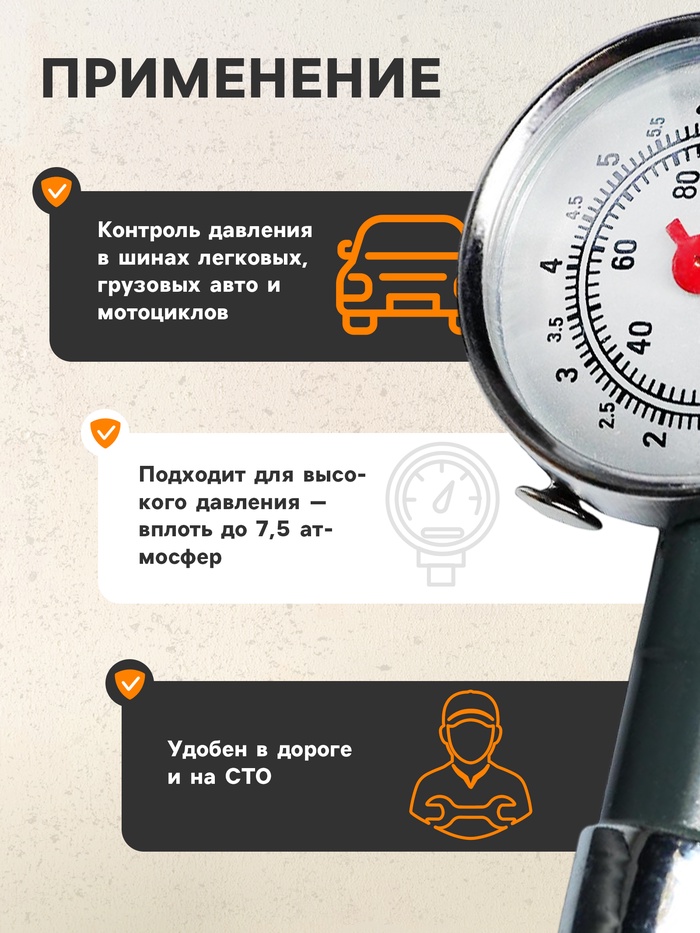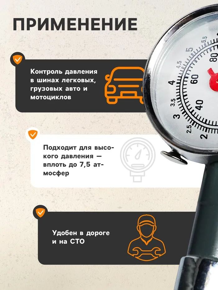 Манометр – важный аксессуар для любого автолюбителя. Его необходимость оценил каждый автомобилист, хоть раз столкнувшийся с повреждением покрышки или ухудшением управляемости из-за приспущенных колес. Механический манометр TORSO предназначен для быстрого контроля за давлением в шинах. Он удобнее компрессорных приборов, не требует разматывания шлангов, выдает точные показания. Особенность устройства – простота конструкции, доступность и максимальная надёжность. На циферблате нанесена шкала, по которой и делается вывод о реальном давлении.
