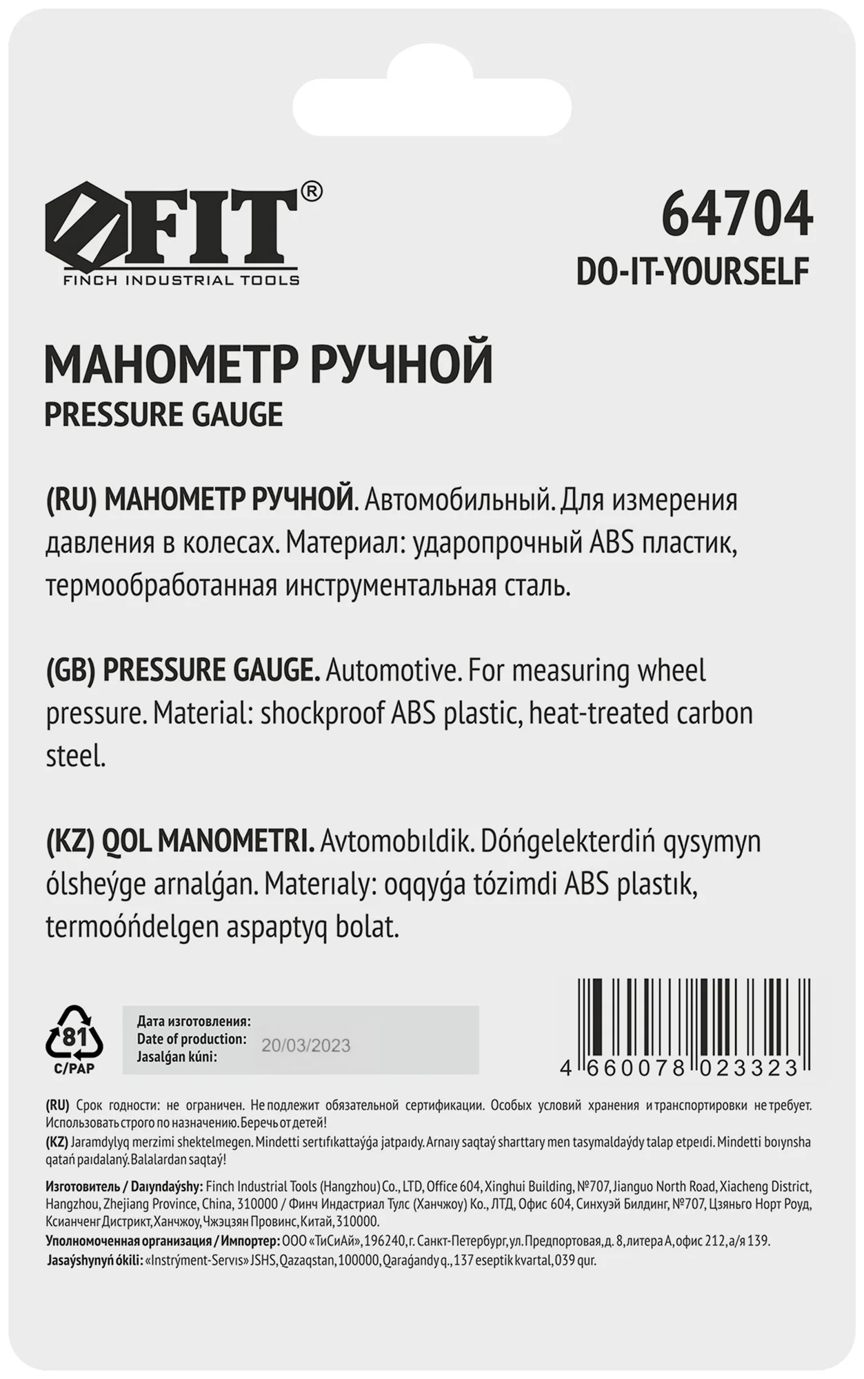 Выберите манометр FIT 64704, чтобы поддерживать оптимальное давление в шинах и обеспечить безопасность на дороге.