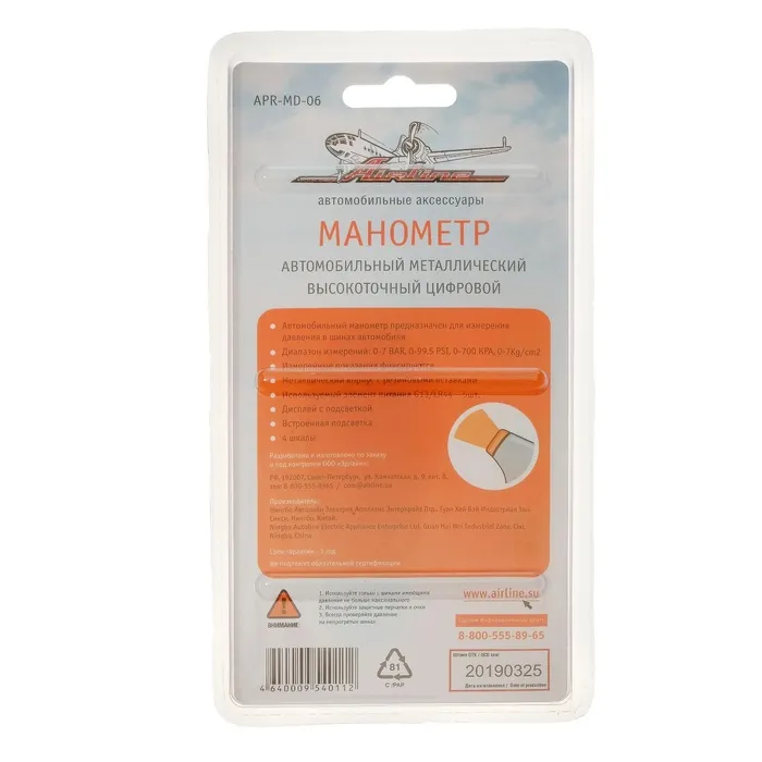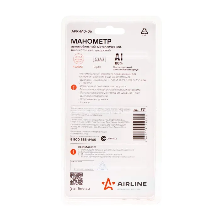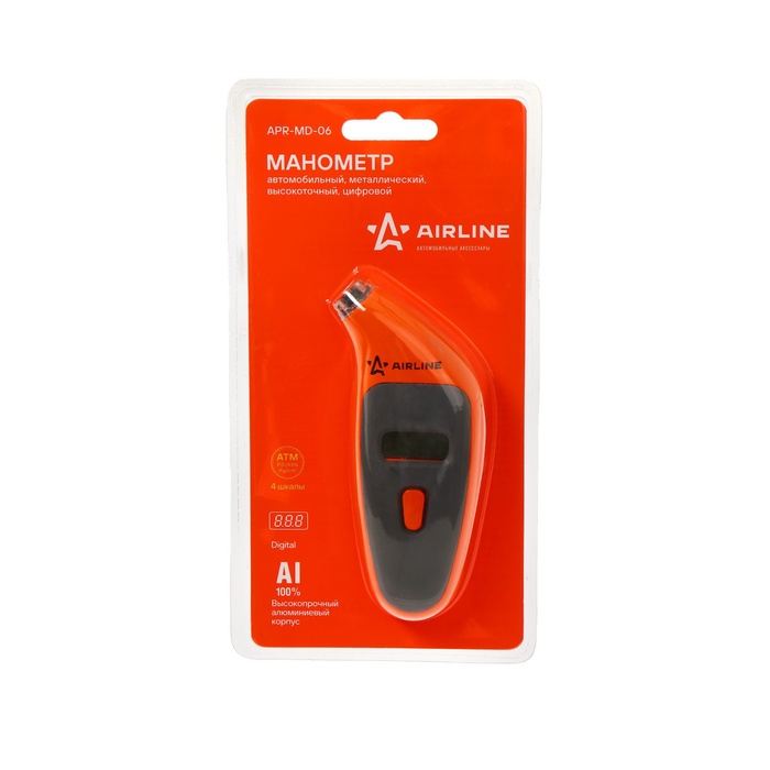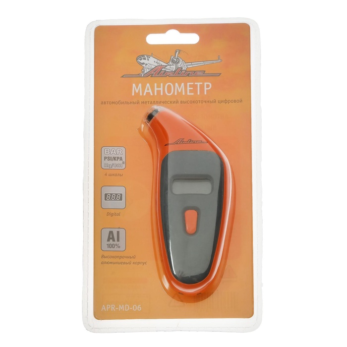 Устройство для измерения давления в шинах автомобиля. Манометр имеет лёгкий и прочный алюминиевый корпус с резиновыми накладками. Измерительная часть имеет светодиодную подсветку. Жидкокристаллический дисплей отображает измеренные показания в четырёх единицах измерения. Выбрать нужные единицы измерения можно во время работы, путём нажатия на кнопку. Подсветка дисплея позволит проводить измерения даже в тёмное время суток. Функция автоматического отключения питания обеспечивает долгий срок службы до замены элемента питания.