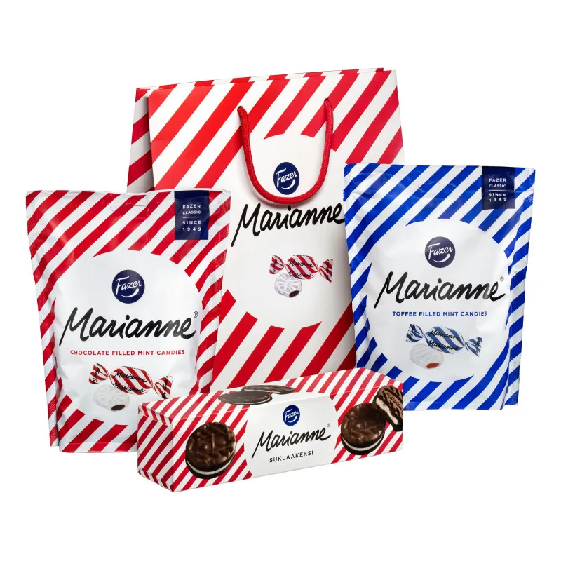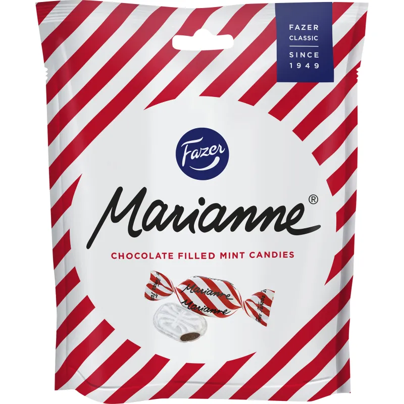 Fazer Marianne — классика в красно-белой упаковке, которая завоевала сердца всех любителей шоколада. Хрустящая мятная оболочка конфеты Marianne скрывает нежный тающий шоколад. Позвольте этому элегантному лакомству очаровать и вас! Упаковка весом 220 граммов.