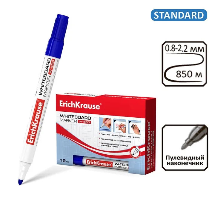 Маркер для доски ErichKrause W-500, 0.8-2.5 мм, для письма на досках сухого стирания, чернила на спиртовой основе без ксилола, синий — Характеристики