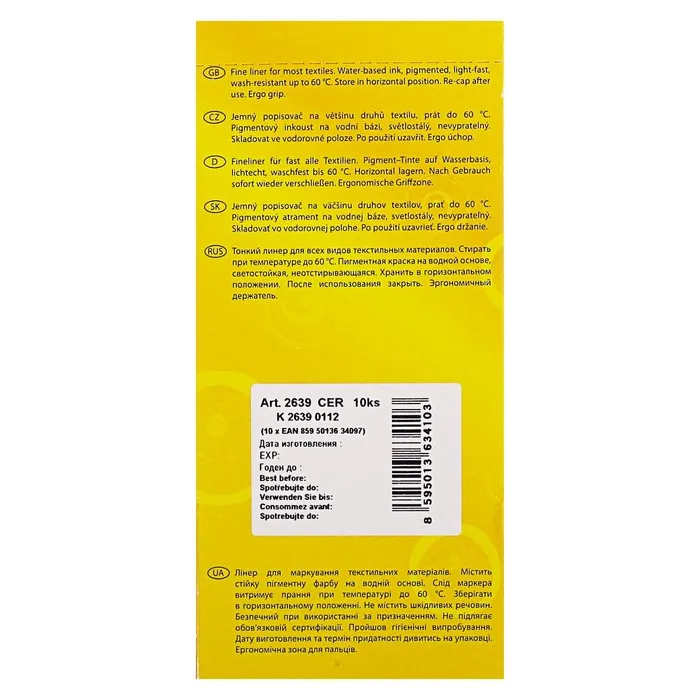 Тонкий линер для всех видов текстильных материалов. Стирать при температуре до 60 градусов. Пигментная краска на водной основе, светостойкая, неотстирывающаяся.