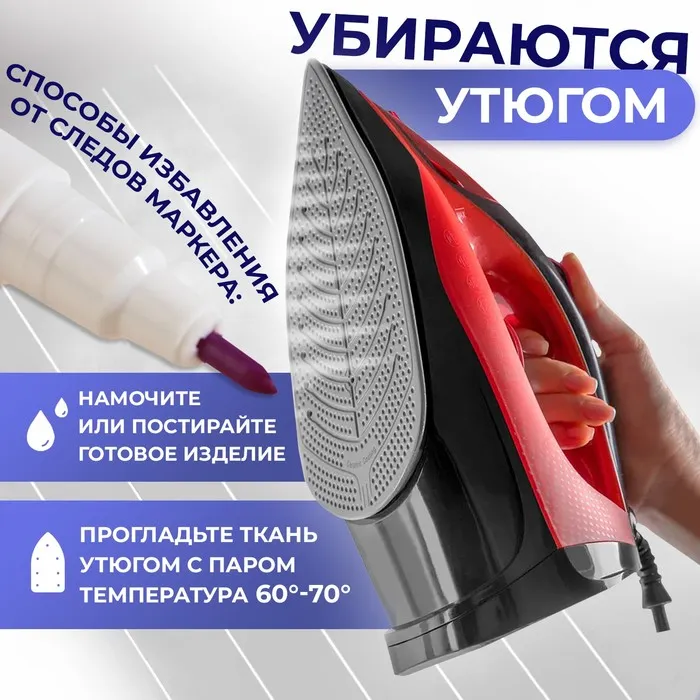 Ровные, тонкие, яркие линии — залог хорошей выкройки. Самоисчезающий маркер для ткани обеспечит аккуратную прорисовку даже самых мелких деталей, которые будут чётко выделяться на фоне ткани. Краска легко исчезает с изделия, не оставляя пятен и полос.