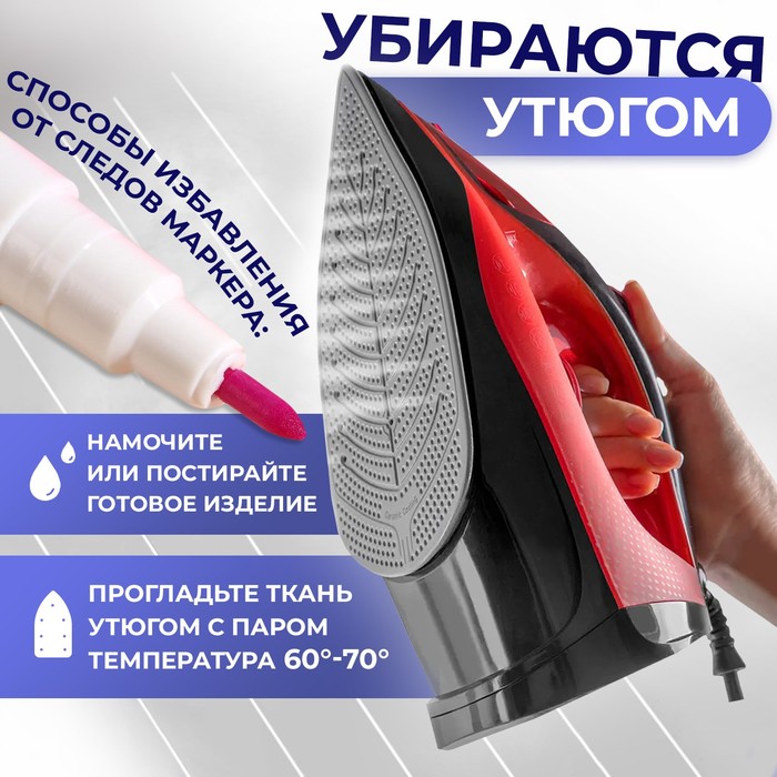 Ровные, тонкие, яркие линии — залог хорошей выкройки. Самоисчезающий маркер для ткани обеспечит аккуратную прорисовку даже самых мелких деталей, которые будут чётко выделяться на фоне ткани. Краска легко исчезает с изделия, не оставляя пятен и полос.