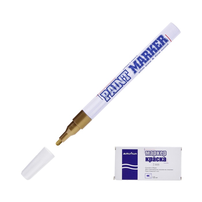 Маркер-краска (лаковый маркер) MunHwa - профессиональный лаковый маркер на нитрооснове. Маркер-краска MunHwa пишет на всех типах поверхностей: металл, дерево, резина, бетон, стекло, кожа. Диаметр пишущего узла - 2 мм.